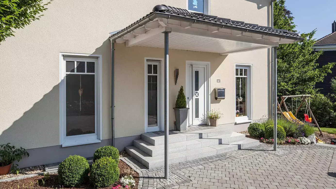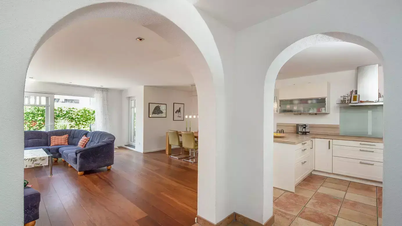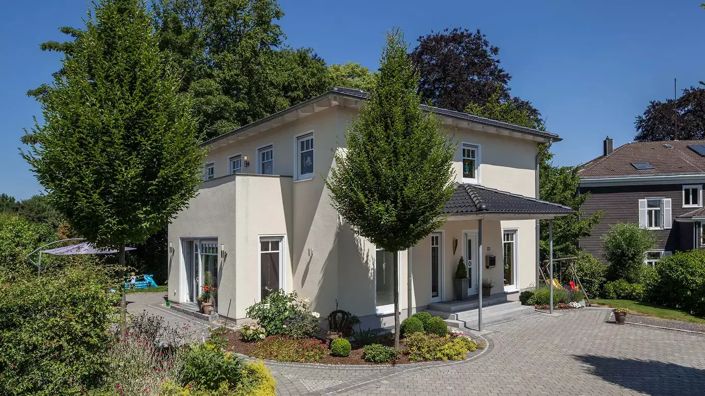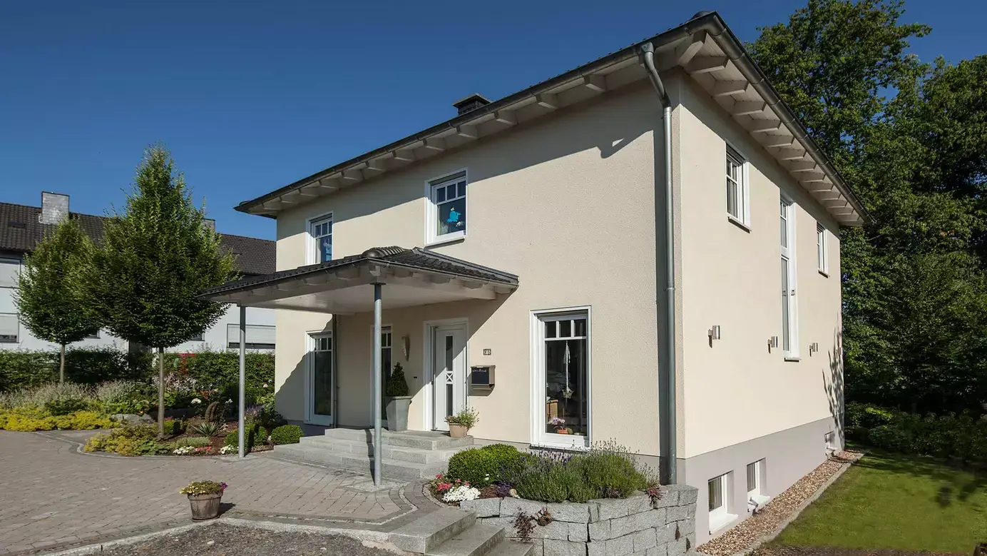 Die zweigeschossige Stadtvilla der Familie Conrad verfügt über ein modernes Wohnkonzept mit einem nahezu quadratischen und somit äußerst komfortablen Grundriss. Die klare Formsprache korrespondiert gelungen mit dem stilsicheren Farbgebung der weißen Fenster, dem warmen gelben Grundton und der Dacheindeckung in Anthrazit. Das flache Walmdach sowie das ausladende Eingangsvordach runden dieses edle mediterrane Konzept ab. Innen sorgen hohe, luftige Räume für ganzheitliche Wohnqualität für vier Personen – sogar das Dachgeschoss bietet noch eine Wohnfläche von über 70 m². Die Kinderzimmer können später unkompliziert zu Hobbyräumen, Gäste- oder Ankleidezimmern umfunktioniert werden. Die offenen Rundbögen an den Raumgrenzen sind wahre Hingucker, ebenso wie die schlanken Glasflächen, die den Blick in die Natur freigeben, ohne selbst zu viele Einblicke zu gewähren. Das Untergeschoss wird mit zwei großzügigen Kellerräume, einer Sauna sowie einem Haustechnikraum, in dem die energieeffiziente Sole-Wasser-Wärmepumpe untergebracht ist, optimal genutzt.