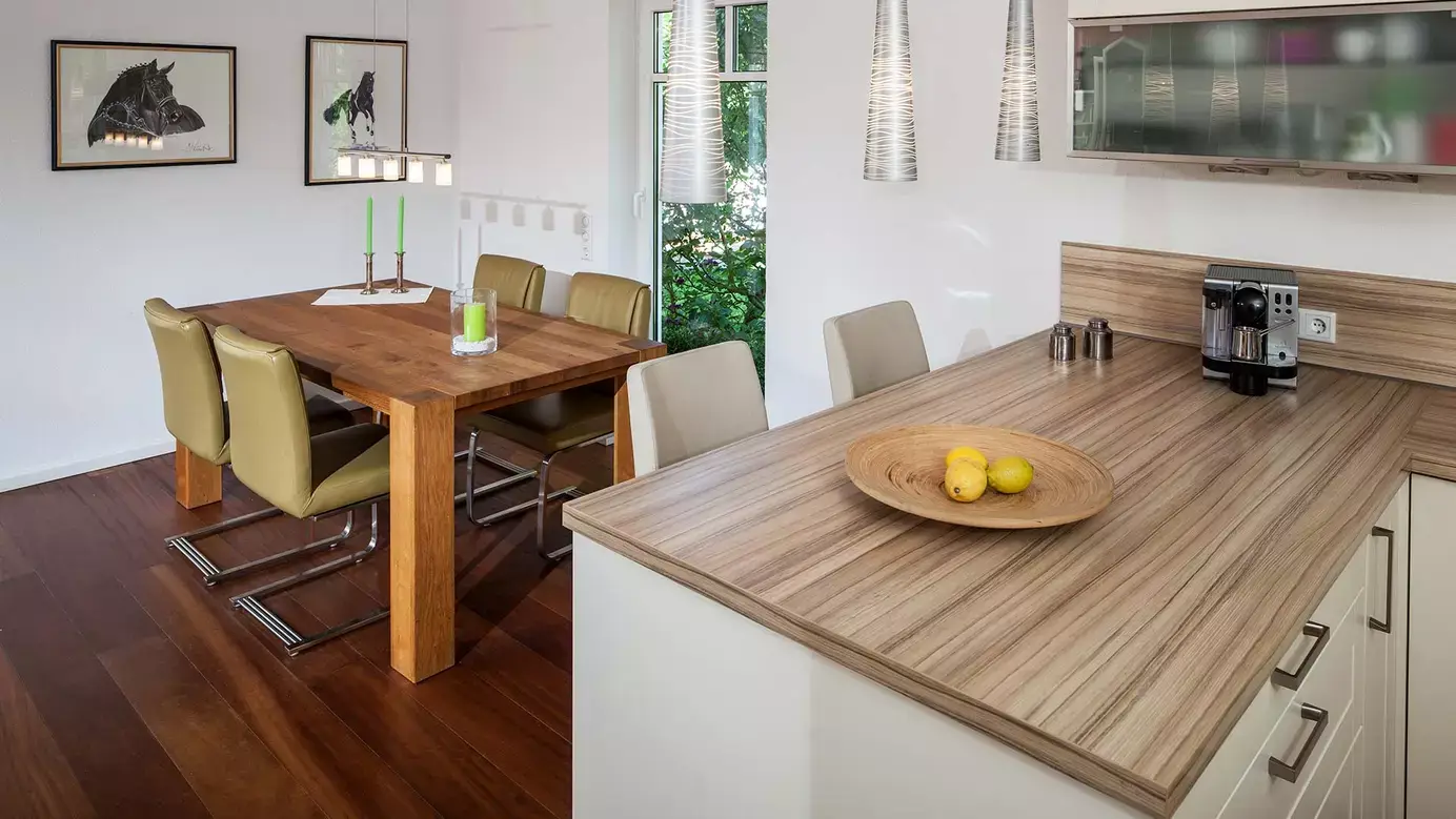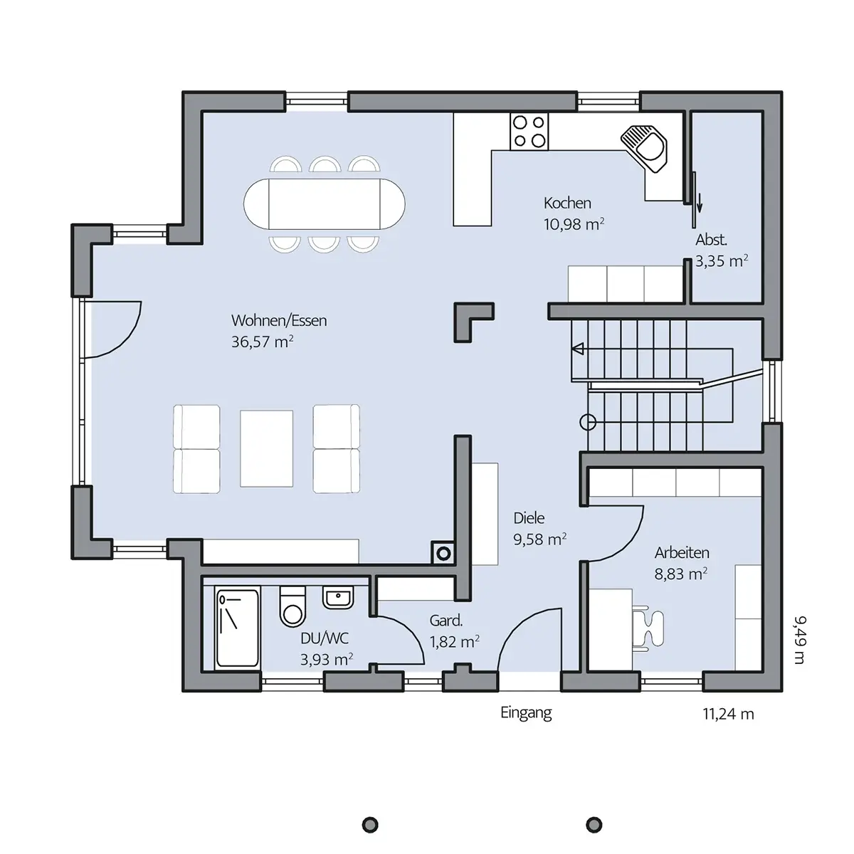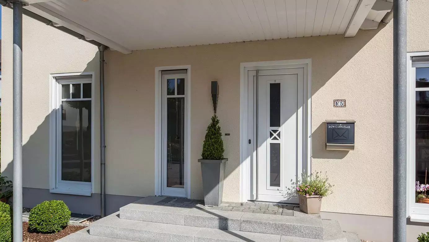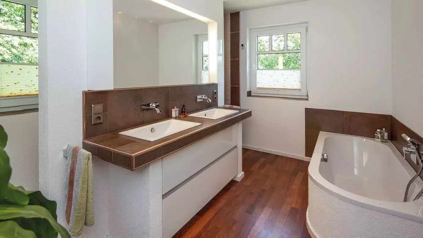 Die zweigeschossige Stadtvilla der Familie Conrad verfügt über ein modernes Wohnkonzept mit einem nahezu quadratischen und somit äußerst komfortablen Grundriss. Die klare Formsprache korrespondiert gelungen mit dem stilsicheren Farbgebung der weißen Fenster, dem warmen gelben Grundton und der Dacheindeckung in Anthrazit. Das flache Walmdach sowie das ausladende Eingangsvordach runden dieses edle mediterrane Konzept ab. Innen sorgen hohe, luftige Räume für ganzheitliche Wohnqualität für vier Personen – sogar das Dachgeschoss bietet noch eine Wohnfläche von über 70 m². Die Kinderzimmer können später unkompliziert zu Hobbyräumen, Gäste- oder Ankleidezimmern umfunktioniert werden. Die offenen Rundbögen an den Raumgrenzen sind wahre Hingucker, ebenso wie die schlanken Glasflächen, die den Blick in die Natur freigeben, ohne selbst zu viele Einblicke zu gewähren. Das Untergeschoss wird mit zwei großzügigen Kellerräume, einer Sauna sowie einem Haustechnikraum, in dem die energieeffiziente Sole-Wasser-Wärmepumpe untergebracht ist, optimal genutzt.