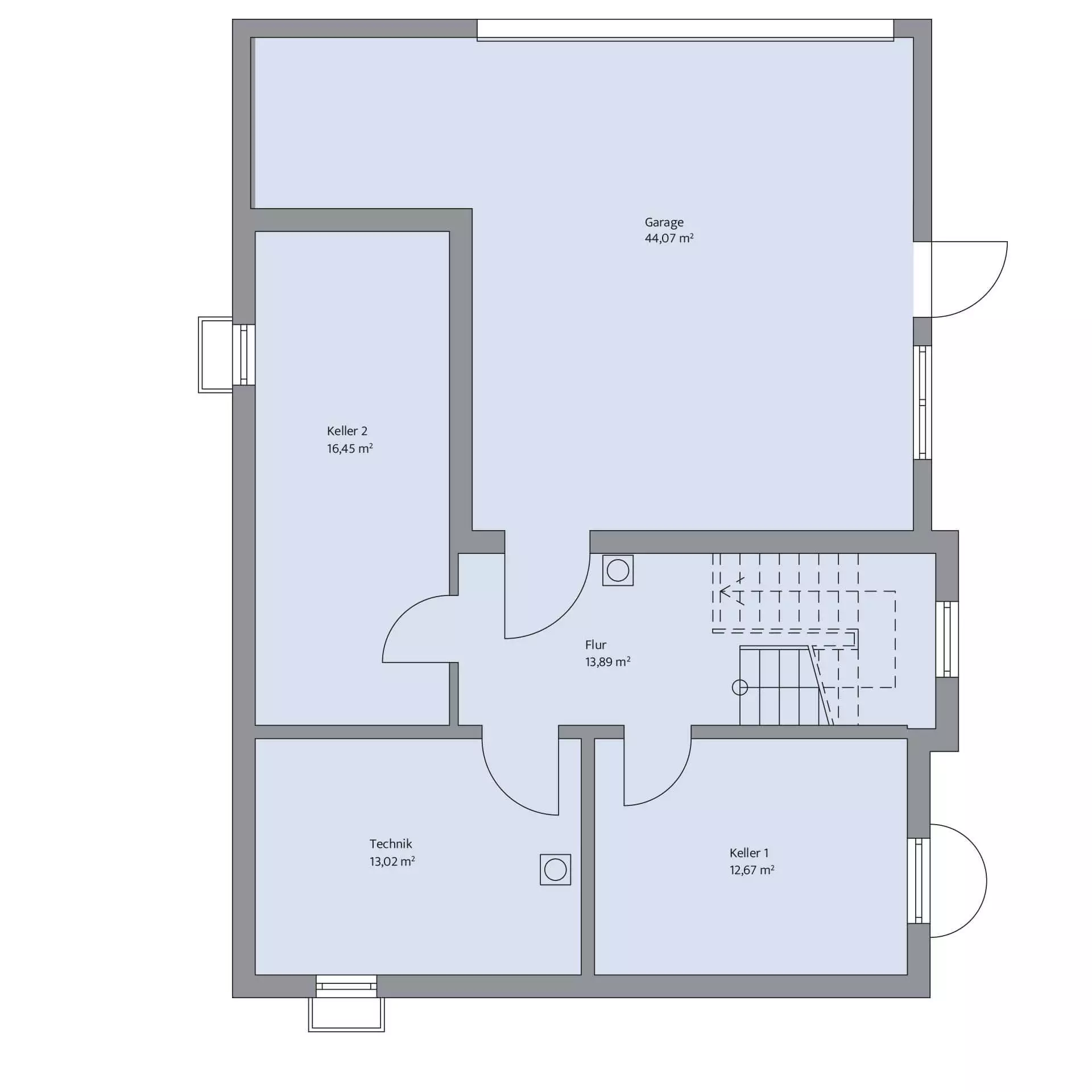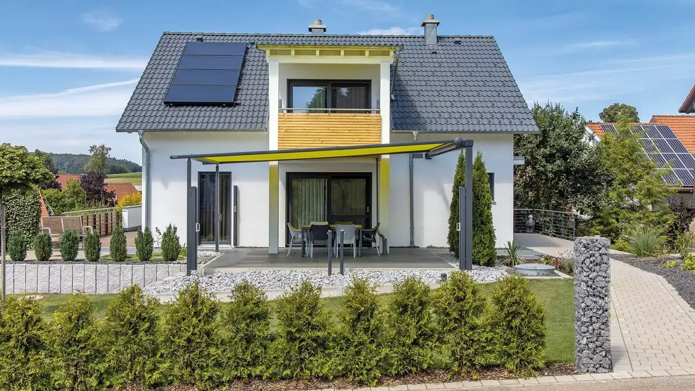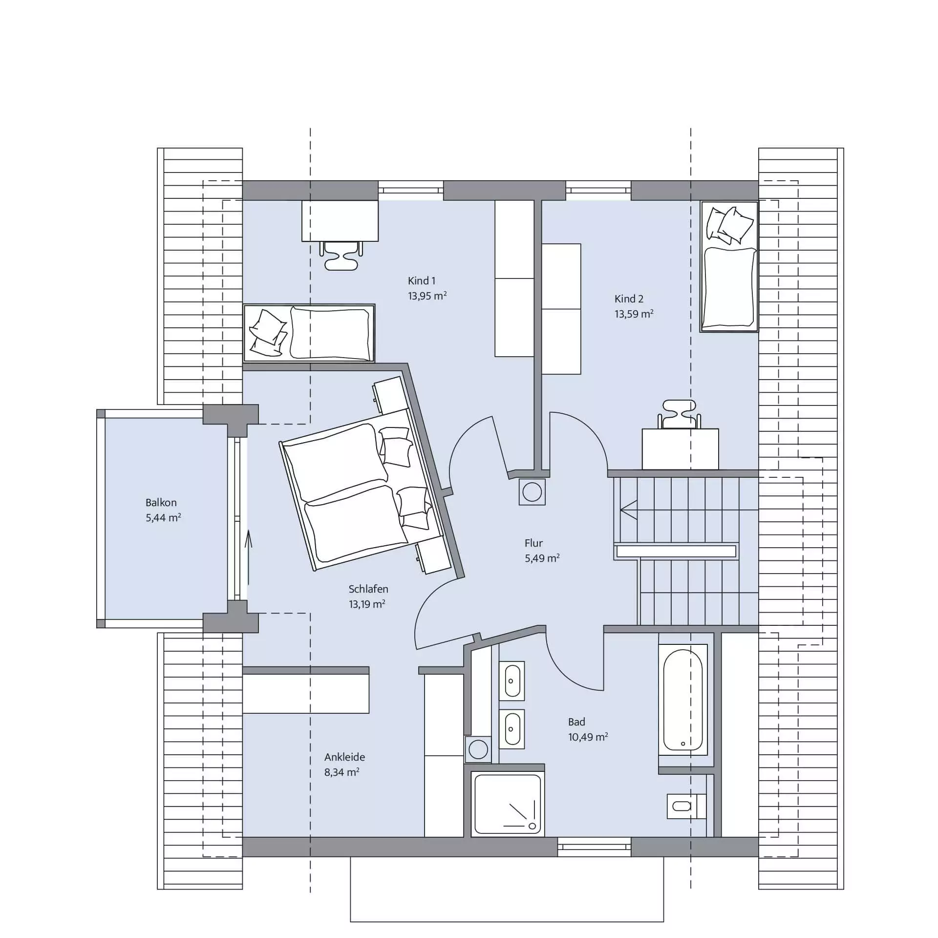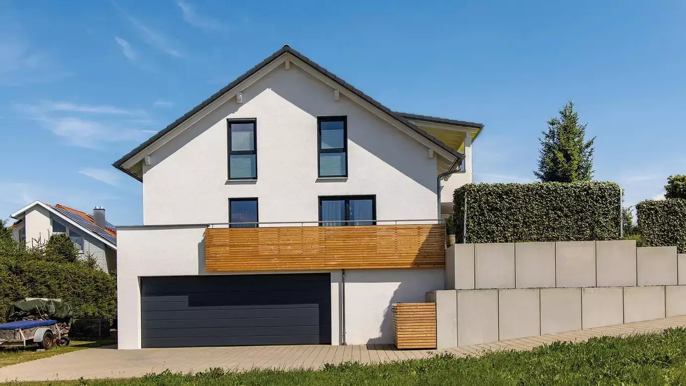 Haus Echterkamp ist ein optimal durchdachtes Familienhaus, in dem sich 146 m² Wohnfläche auf Erdgeschoss und Dachgeschoss verteilen und durch ein Kellergeschoss ergänzt werden. Zeitlos-modern erstrahlt die weiße Hausfassade, abgerundet durch eine Dacheindeckung, Fenster, Türen und das breite Garagentor im Anthrazitton. Der überdachte Balkon und die darunter liegende Terrasse sind ein optisches Highlight. Im Kellergeschoss befinden sich die Garage, ein Technikraum sowie zwei Kellerräume. Rund dreiviertel der fast 85 m² großen Wohnfläche im Erdgeschoss nimmt der helle, großzügige Wohn-/Essbereich mit offener Küche und Abstellraum ein. Im Außenbereich wird der Wohn-/Essbereich umrahmt von einem fast 22 m² großen Balkon, der sich aus dem vorgezogenen Teil der Garage ergibt, mit nahtlosem Übergang in die überdachte Terrasse mit Garten. Des Weiteren verfügt das Erdgeschoss über ein Duschbad mit Gäste-WC. Auf knapp 62 m² sind im Dachgeschoss die Privaträume verteilt. Über einen zentralen Flur gelangt man hier in die beiden jeweils rund 14 m² großen Kinderzimmer, das Familienbad mit Dusche und Badewanne sowie in das Elternschlafzimmer mit eigenem Ankleidebereich und überdachtem Balkon.