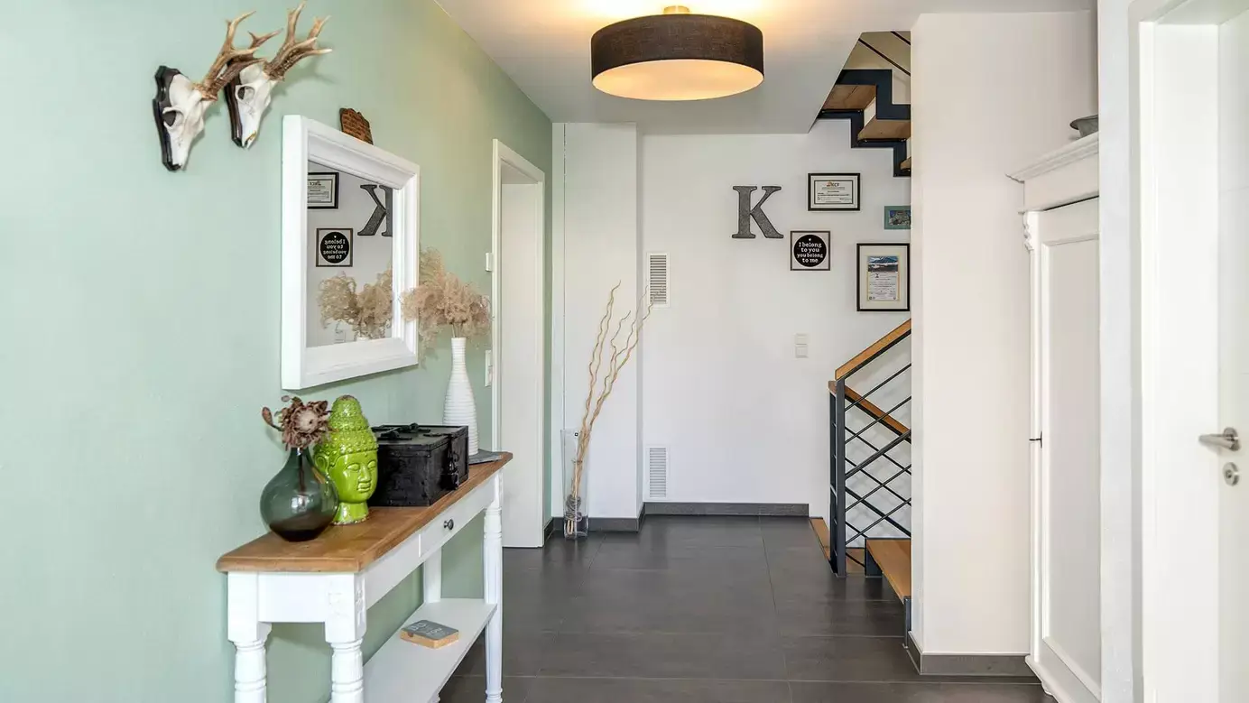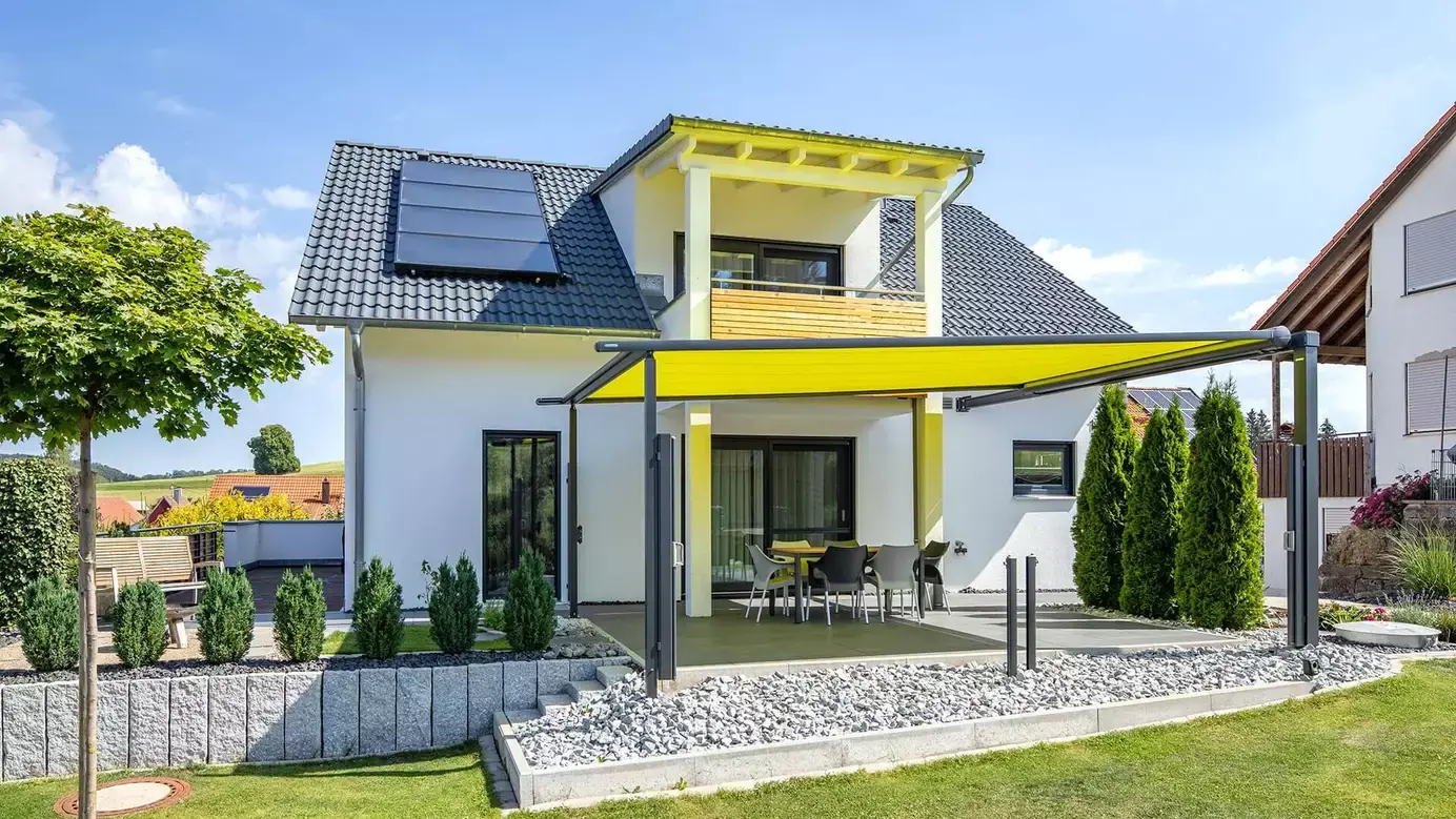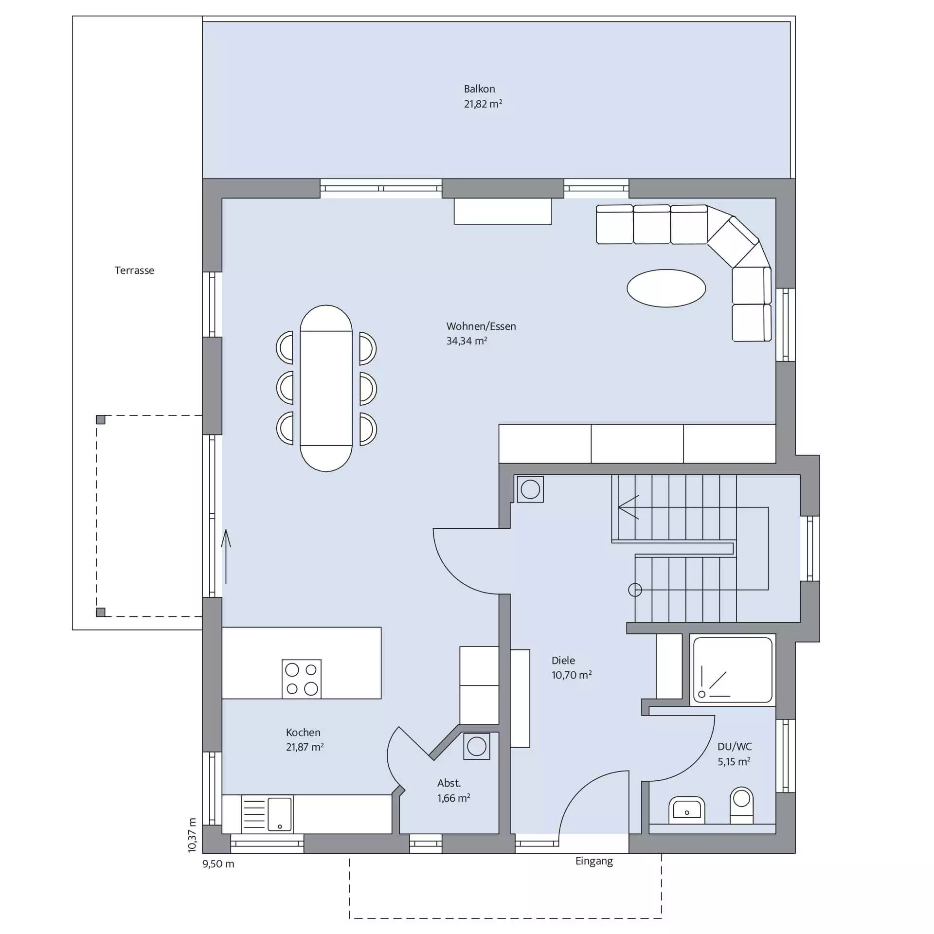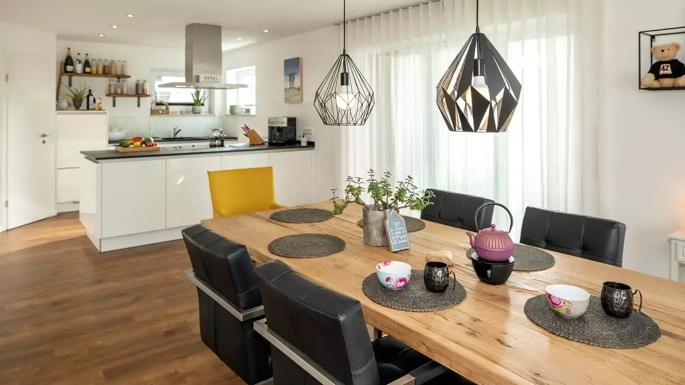 Haus Echterkamp ist ein optimal durchdachtes Familienhaus, in dem sich 146 m² Wohnfläche auf Erdgeschoss und Dachgeschoss verteilen und durch ein Kellergeschoss ergänzt werden. Zeitlos-modern erstrahlt die weiße Hausfassade, abgerundet durch eine Dacheindeckung, Fenster, Türen und das breite Garagentor im Anthrazitton. Der überdachte Balkon und die darunter liegende Terrasse sind ein optisches Highlight. Im Kellergeschoss befinden sich die Garage, ein Technikraum sowie zwei Kellerräume. Rund dreiviertel der fast 85 m² großen Wohnfläche im Erdgeschoss nimmt der helle, großzügige Wohn-/Essbereich mit offener Küche und Abstellraum ein. Im Außenbereich wird der Wohn-/Essbereich umrahmt von einem fast 22 m² großen Balkon, der sich aus dem vorgezogenen Teil der Garage ergibt, mit nahtlosem Übergang in die überdachte Terrasse mit Garten. Des Weiteren verfügt das Erdgeschoss über ein Duschbad mit Gäste-WC. Auf knapp 62 m² sind im Dachgeschoss die Privaträume verteilt. Über einen zentralen Flur gelangt man hier in die beiden jeweils rund 14 m² großen Kinderzimmer, das Familienbad mit Dusche und Badewanne sowie in das Elternschlafzimmer mit eigenem Ankleidebereich und überdachtem Balkon.
