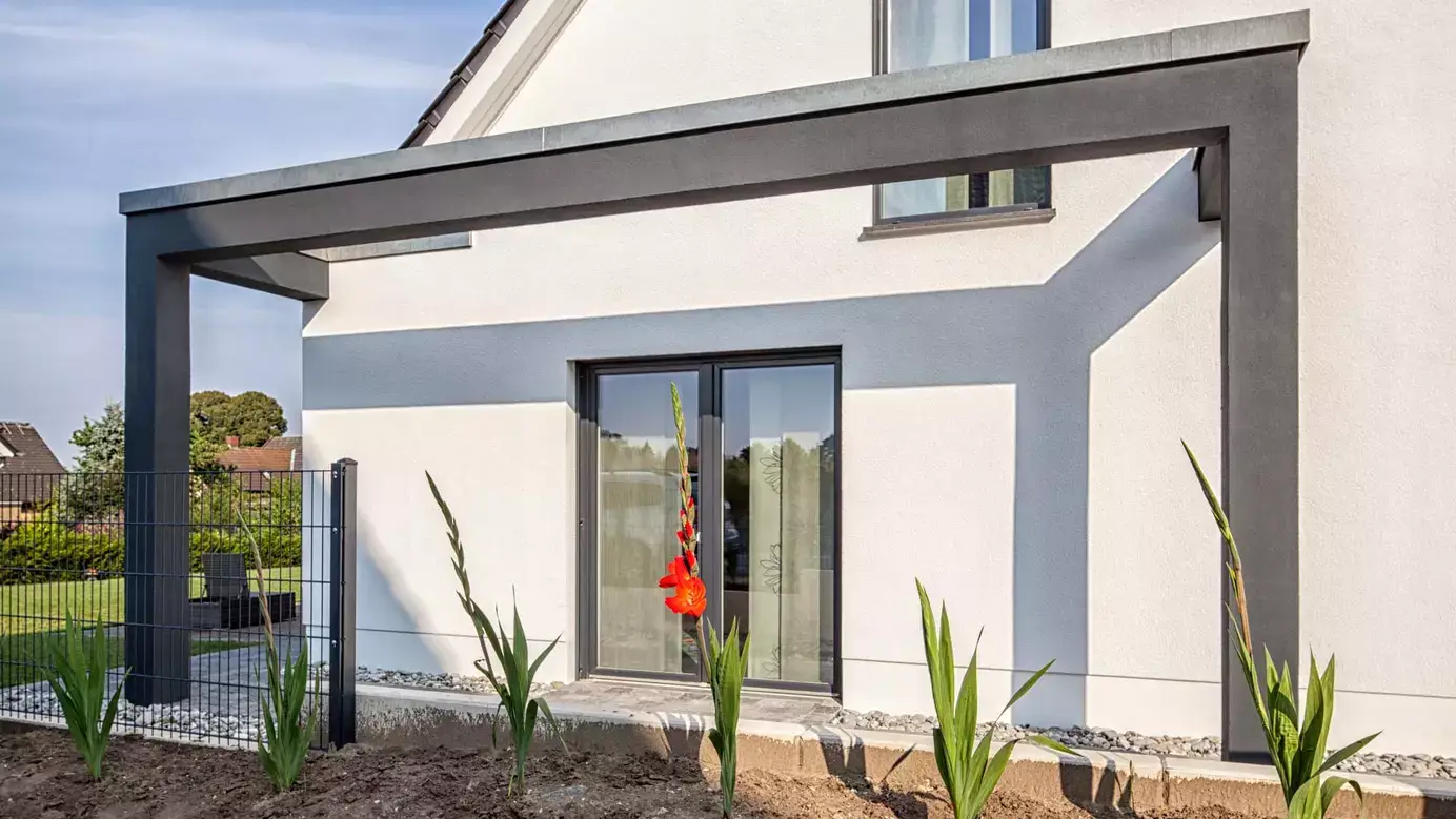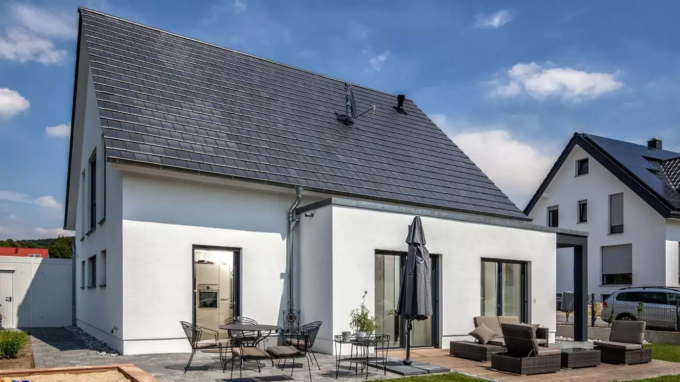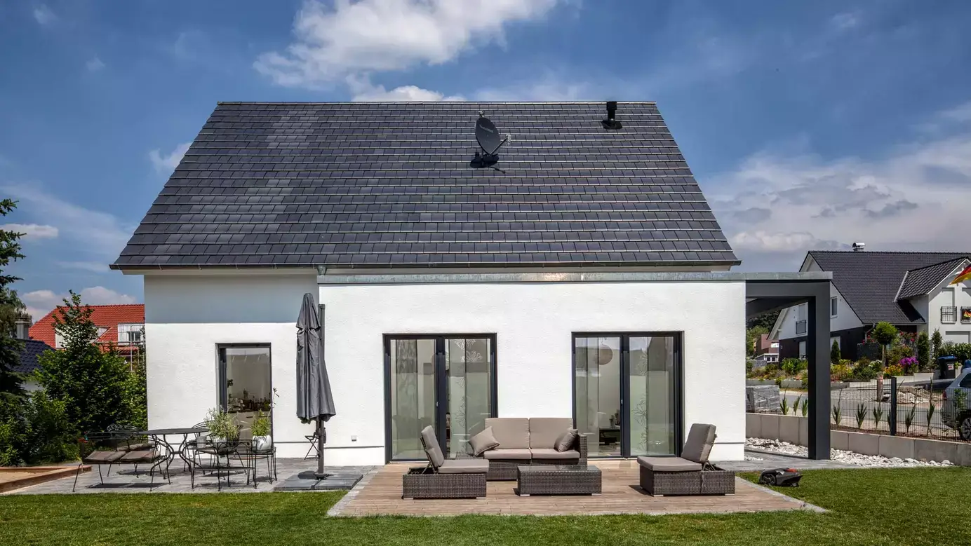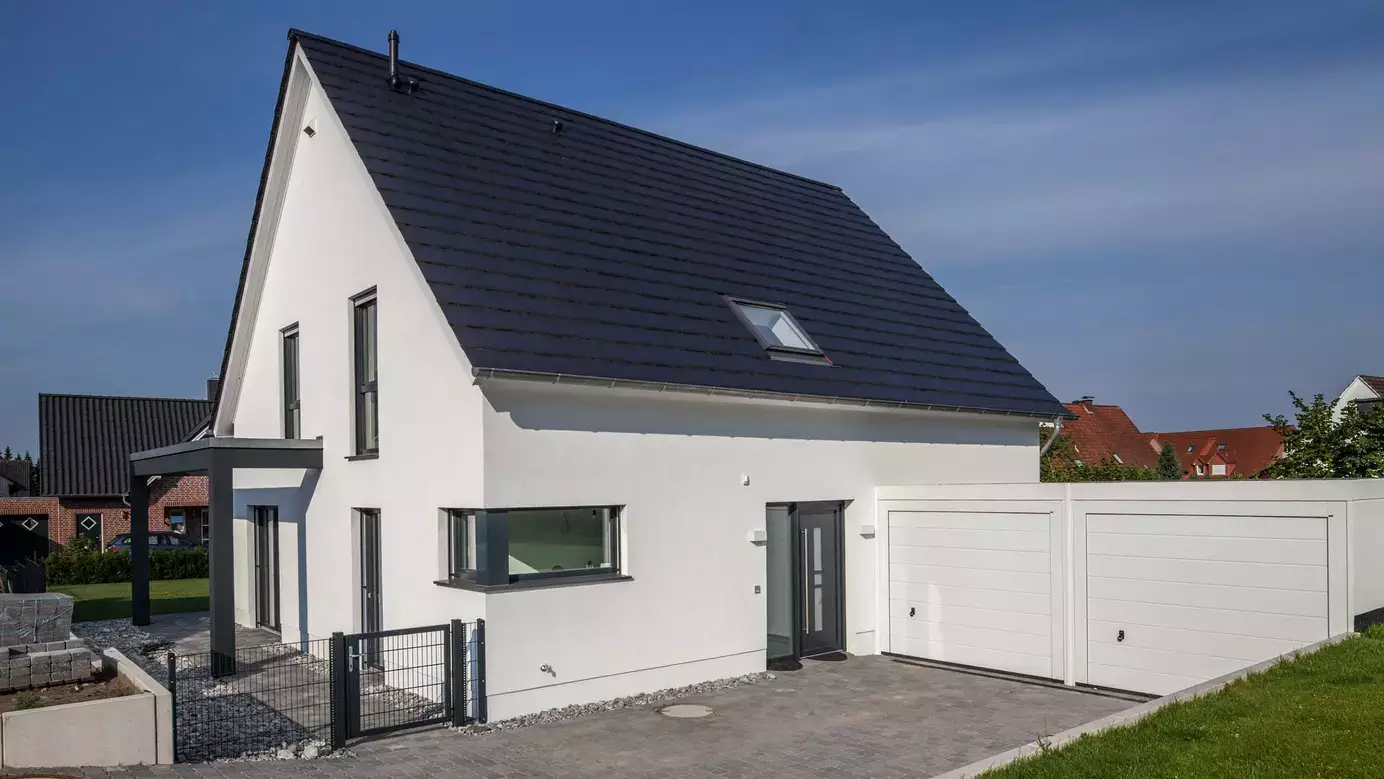 Wer für seine Familie etwas Besonderes sucht, liegt bei Haus Erdmann genau richtig. Die schnörkellose Fassade überzeugt durch ihren puristisch-eleganten Entwurf, der mit klassischem Satteldach und weiß verputzter Fassade auf Zurückhaltung setzt. Dazu passt die ruhige Fenstergeometrie, deren Symmetrie durch eine Übereckverglasung neben dem Eingang spielerisch durchbrochen wird. Ein Anbau mit Flachdach auf der Gartenseite und ein farblich abgesetztes, kubisches Element unterstreichen den modernen Charakter. Auf zwei Ebenen bietet das Haus vier bis fünf Personen auf 173 m² viel Raum zur Entfaltung – und das ganz ohne Keller. Herzstück des Hauses ist der offene Wohnraum, der Wohnzimmer, Esszimmer und Küche umfasst und mit gut 45 m² fast die Hälfte der Grundfläche einnimmt. Ein Highlight ist das Elternbad mit Komfortdusche, Wanne, Doppelwaschtisch und Sauna. Zu den Vorzügen des Hauses gehört außerdem eine sehr gut gedämmte Gebäudehülle mit niedrigen U-Werten, die zusammen mit einer Gas-Brennwerttherme für niedrige Heizkosten sorgt.
