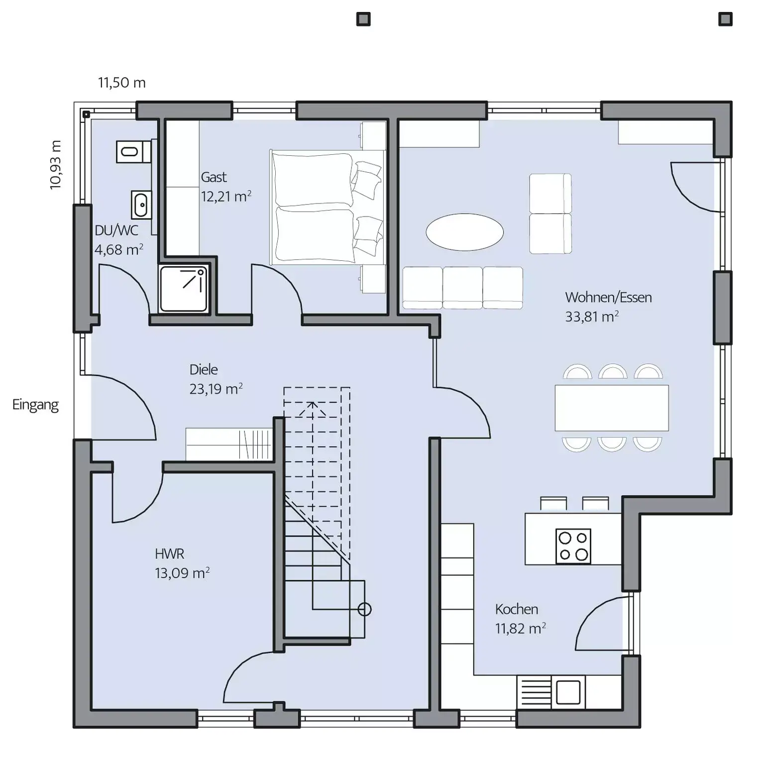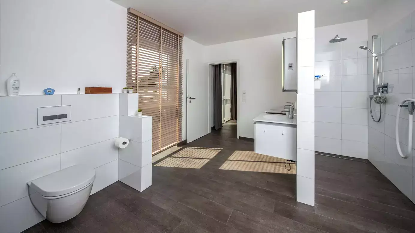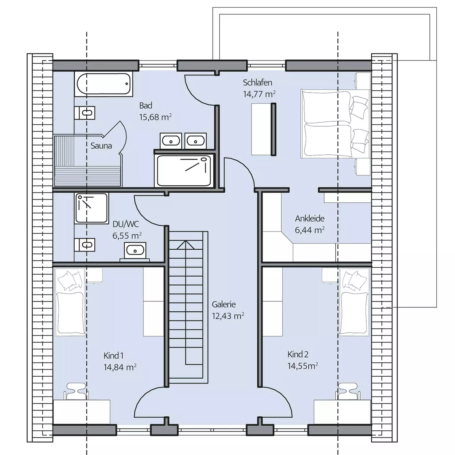 Wer für seine Familie etwas Besonderes sucht, liegt bei Haus Erdmann genau richtig. Die schnörkellose Fassade überzeugt durch ihren puristisch-eleganten Entwurf, der mit klassischem Satteldach und weiß verputzter Fassade auf Zurückhaltung setzt. Dazu passt die ruhige Fenstergeometrie, deren Symmetrie durch eine Übereckverglasung neben dem Eingang spielerisch durchbrochen wird. Ein Anbau mit Flachdach auf der Gartenseite und ein farblich abgesetztes, kubisches Element unterstreichen den modernen Charakter. Auf zwei Ebenen bietet das Haus vier bis fünf Personen auf 173 m² viel Raum zur Entfaltung – und das ganz ohne Keller. Herzstück des Hauses ist der offene Wohnraum, der Wohnzimmer, Esszimmer und Küche umfasst und mit gut 45 m² fast die Hälfte der Grundfläche einnimmt. Ein Highlight ist das Elternbad mit Komfortdusche, Wanne, Doppelwaschtisch und Sauna. Zu den Vorzügen des Hauses gehört außerdem eine sehr gut gedämmte Gebäudehülle mit niedrigen U-Werten, die zusammen mit einer Gas-Brennwerttherme für niedrige Heizkosten sorgt.