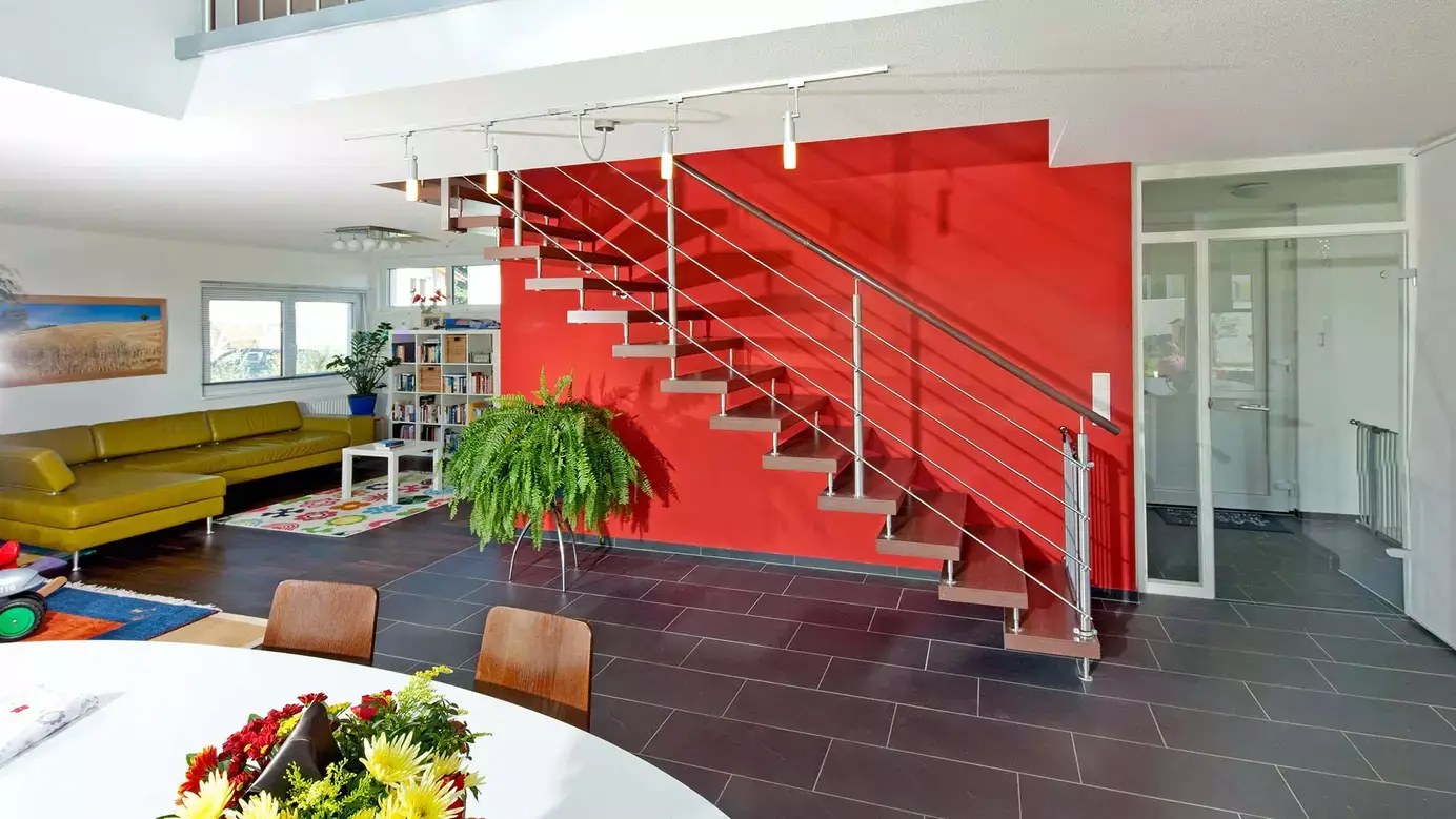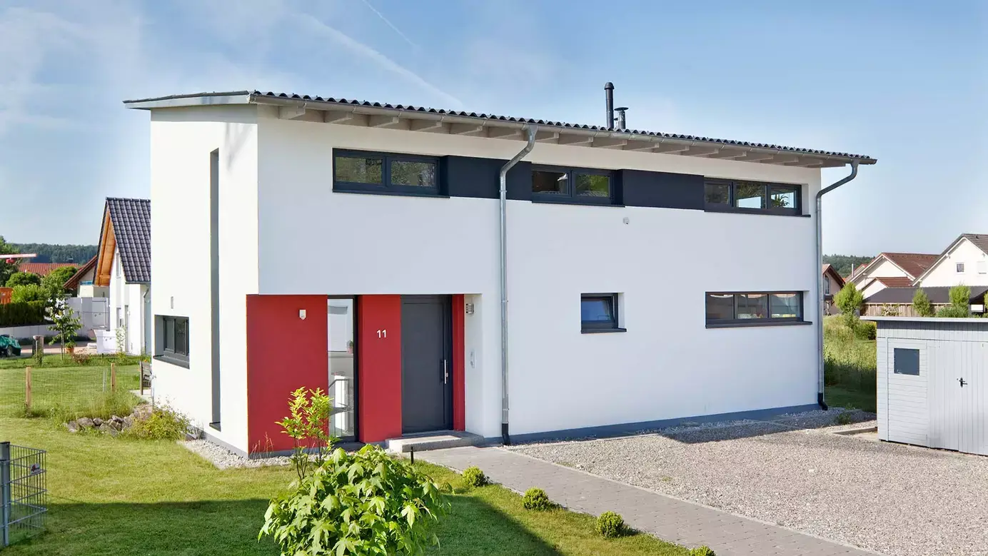 Das Pultdach ist eine Klasse für sich. Optimal am Standort ausgerichtet fängt es das Sonnenlicht ein und bietet mehr Raum im Obergeschoss. Und, wie hier, eine lichtdurchflutete Empore. Für alle, die hohe Räume lieben und modernen Geschmack beweisen. Die schmalen Fensterschlitze im Norden und der farblich akzentuierte Eingangsbereich kündigen bereits von außen ein außergewöhnliches Wohnerlebnis an.