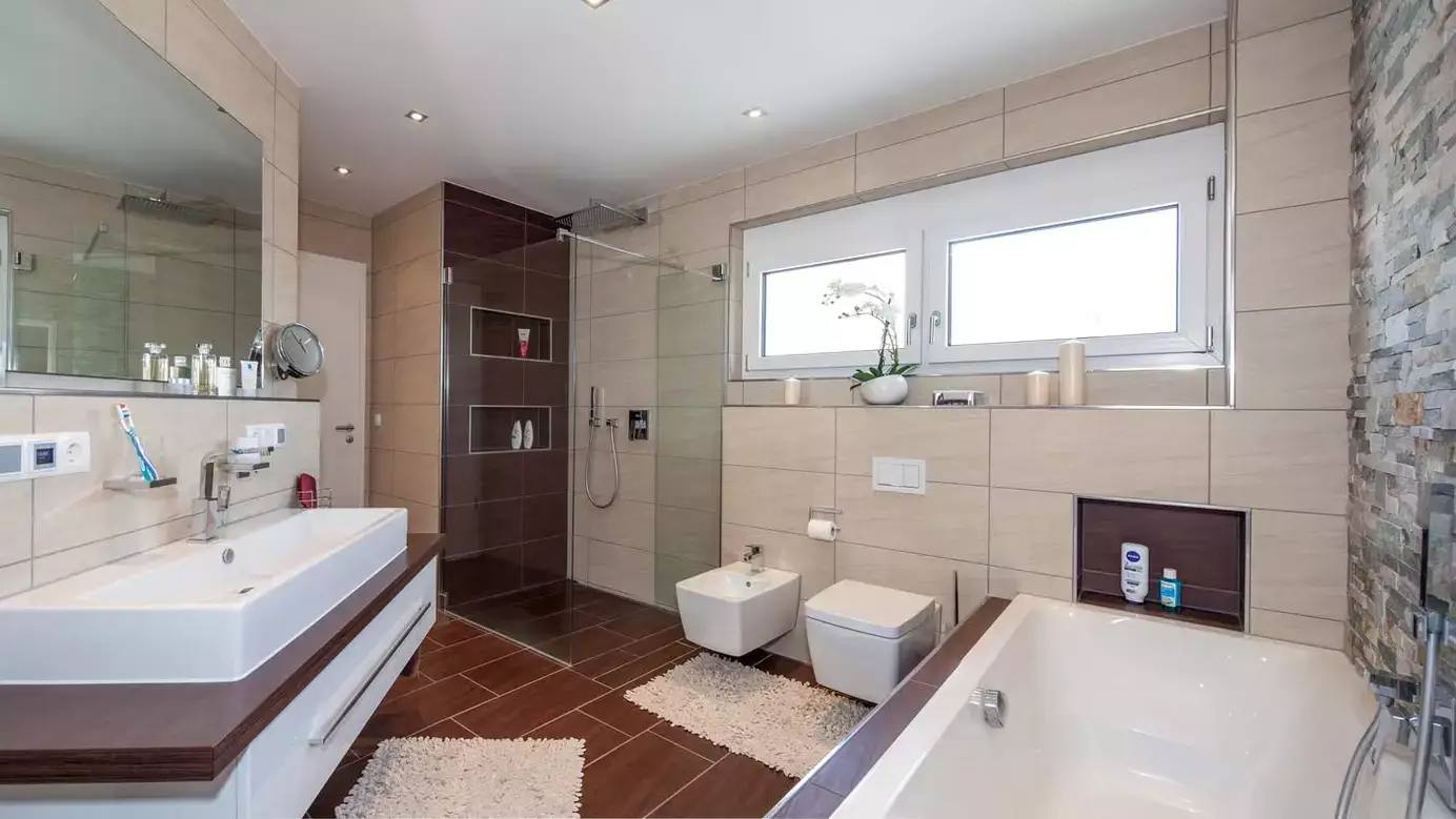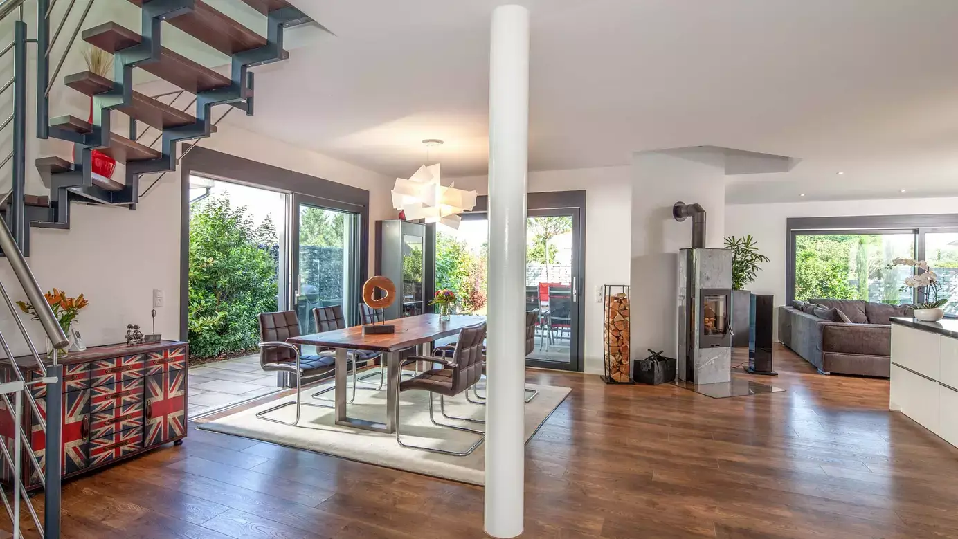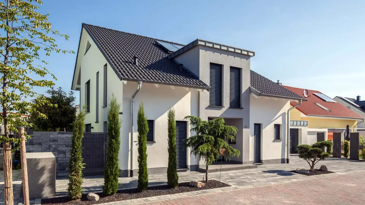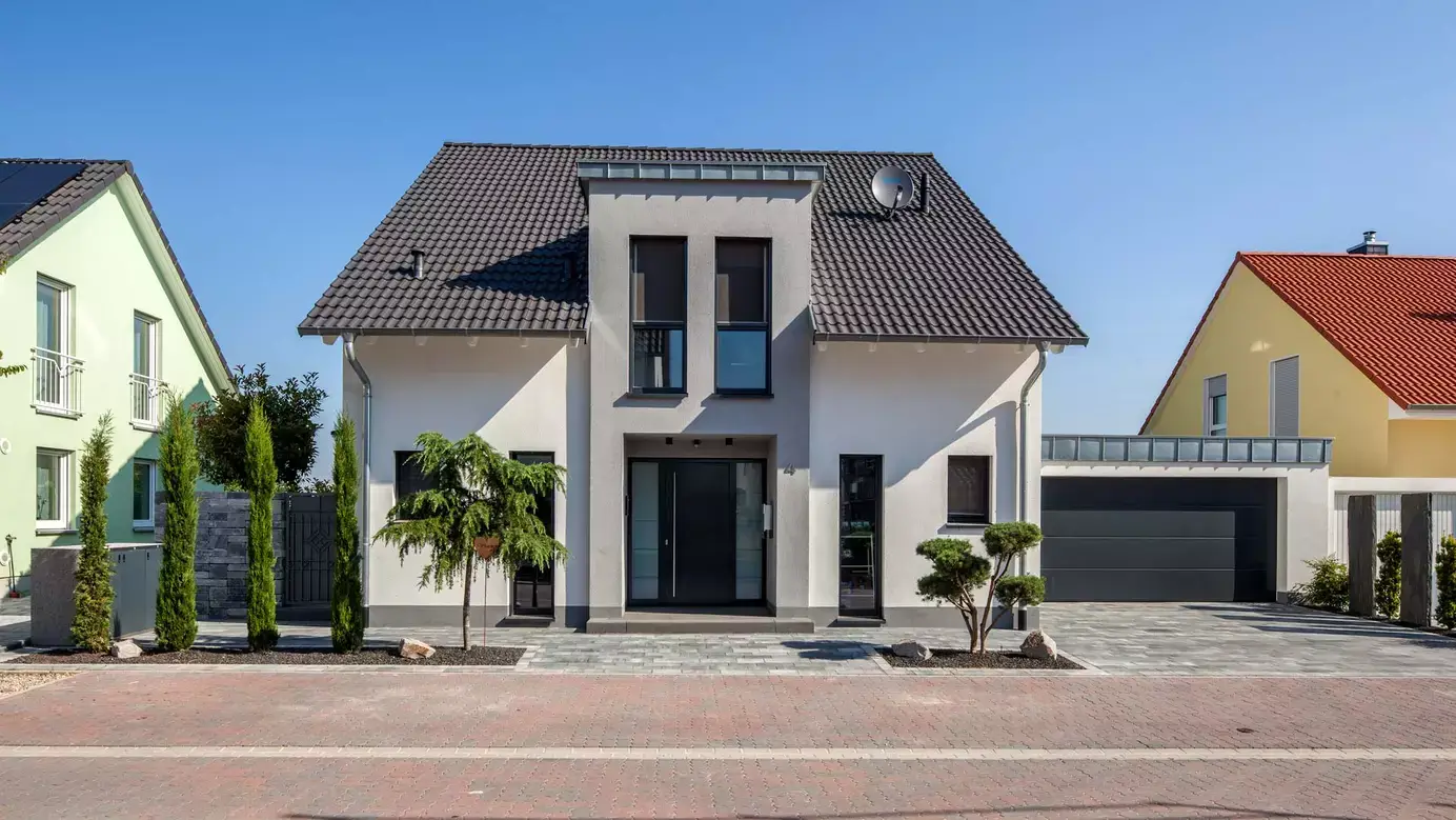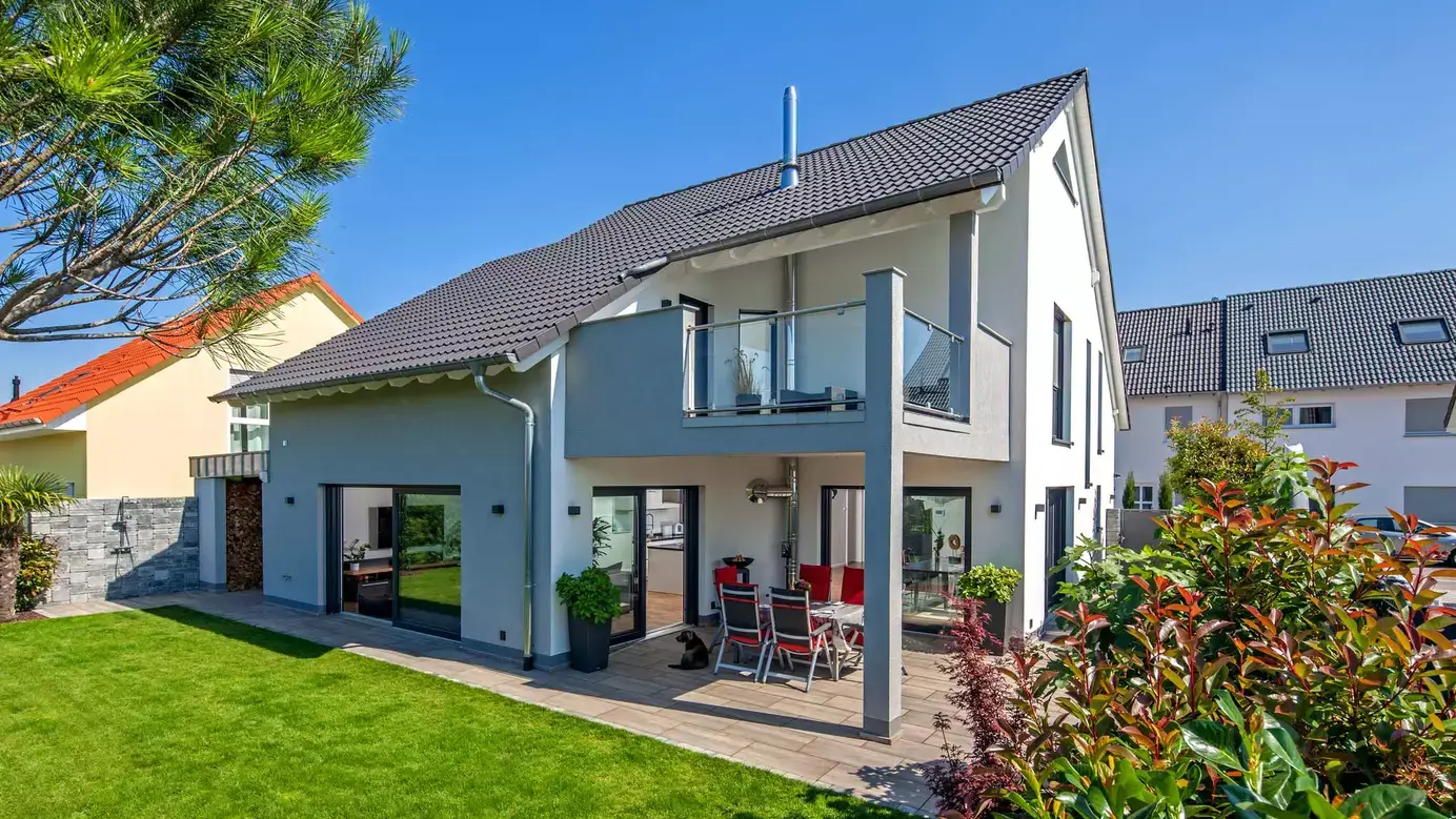 Als individuell geplantes Satteldachhaus überzeugt Haus Fuchs schon auf den ersten Blick durch seine elegante Symmetrie, schlanken Lichtbänder auf der Eingangsseite und asymmetrische Dachgeometrie auf den Giebelseiten. Der Kontrast zwischen Weiß und Anthrazit betont das klare und edle Erscheinungsbild zusätzlich. Am Ostgiebel befindet sich ein großer Balkon mit Teilüberdachung und darunter eine geschützte Terrasse. Offenheit und viel Licht prägen auch den Grundriss im Erdgeschoss: Eingangsbereich, Diele, Garderobe und Treppe sind ins offene Wohnensemble integriert. Das Dachgeschoss ist für vier Personen ausgelegt und bietet ausreichend große Individualräume und viel Komfort. So verfügt der Elterntrakt über ein Bad mit Dusche und Wanne sowie eine Ankleide, die auch von den Kinderzimmern aus genutzt werden könnte.