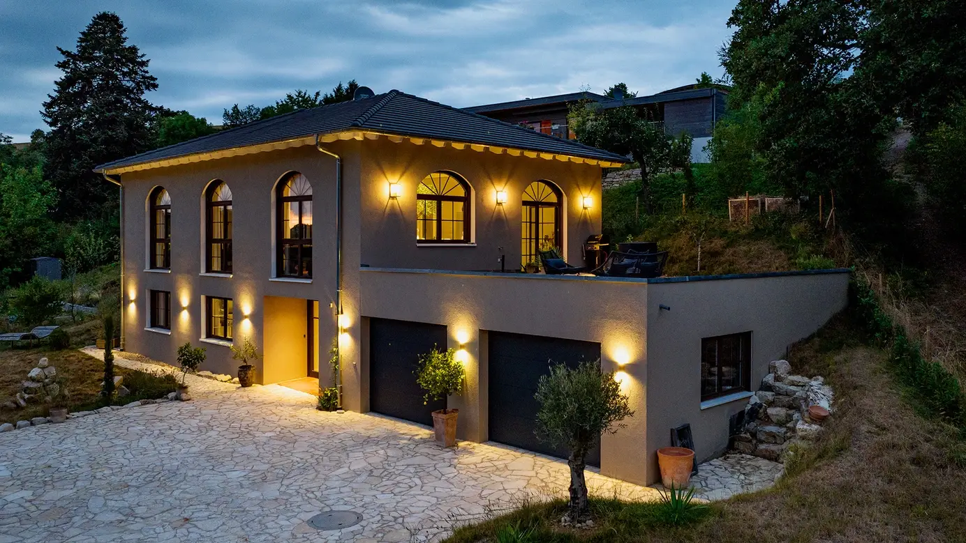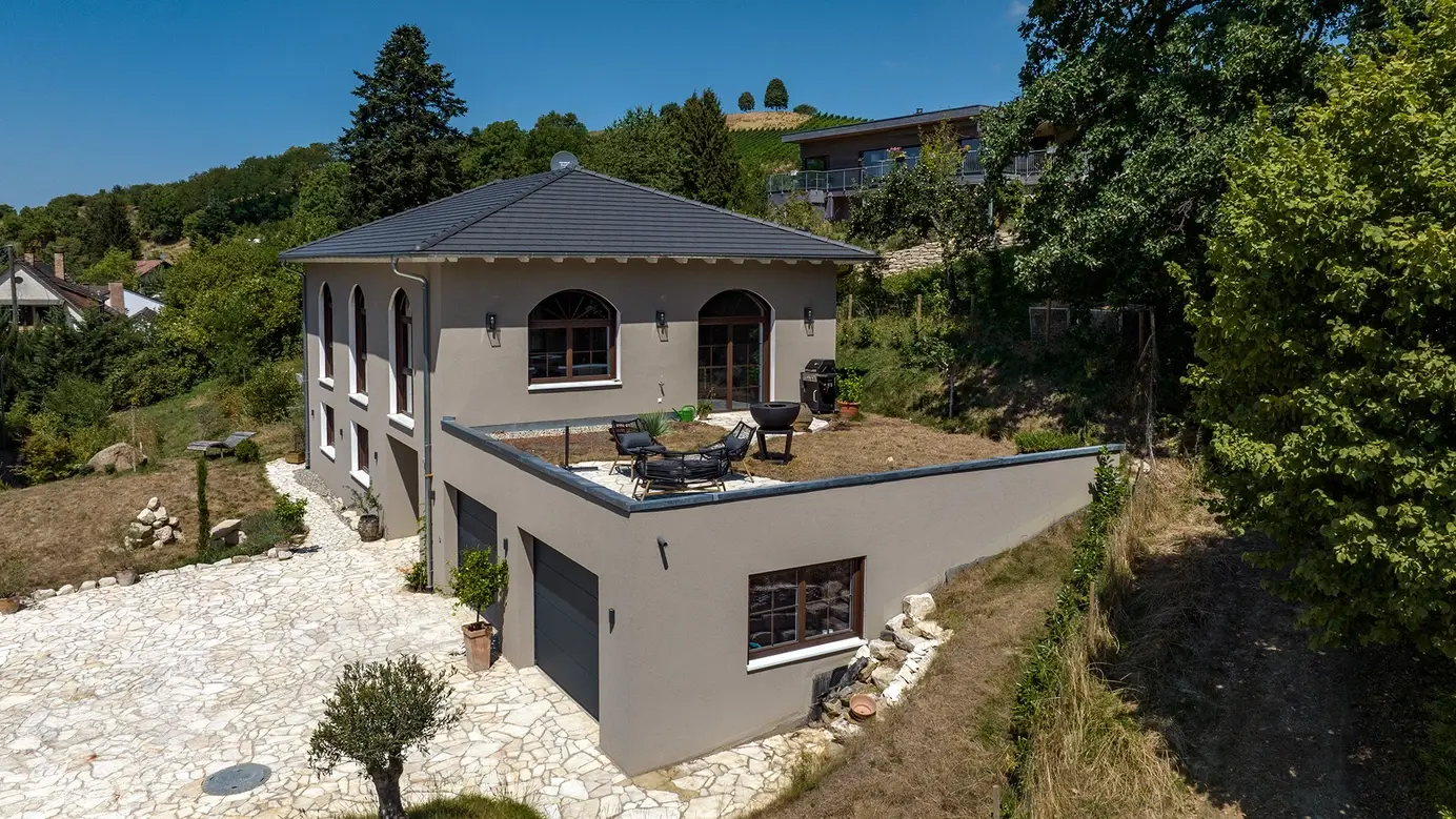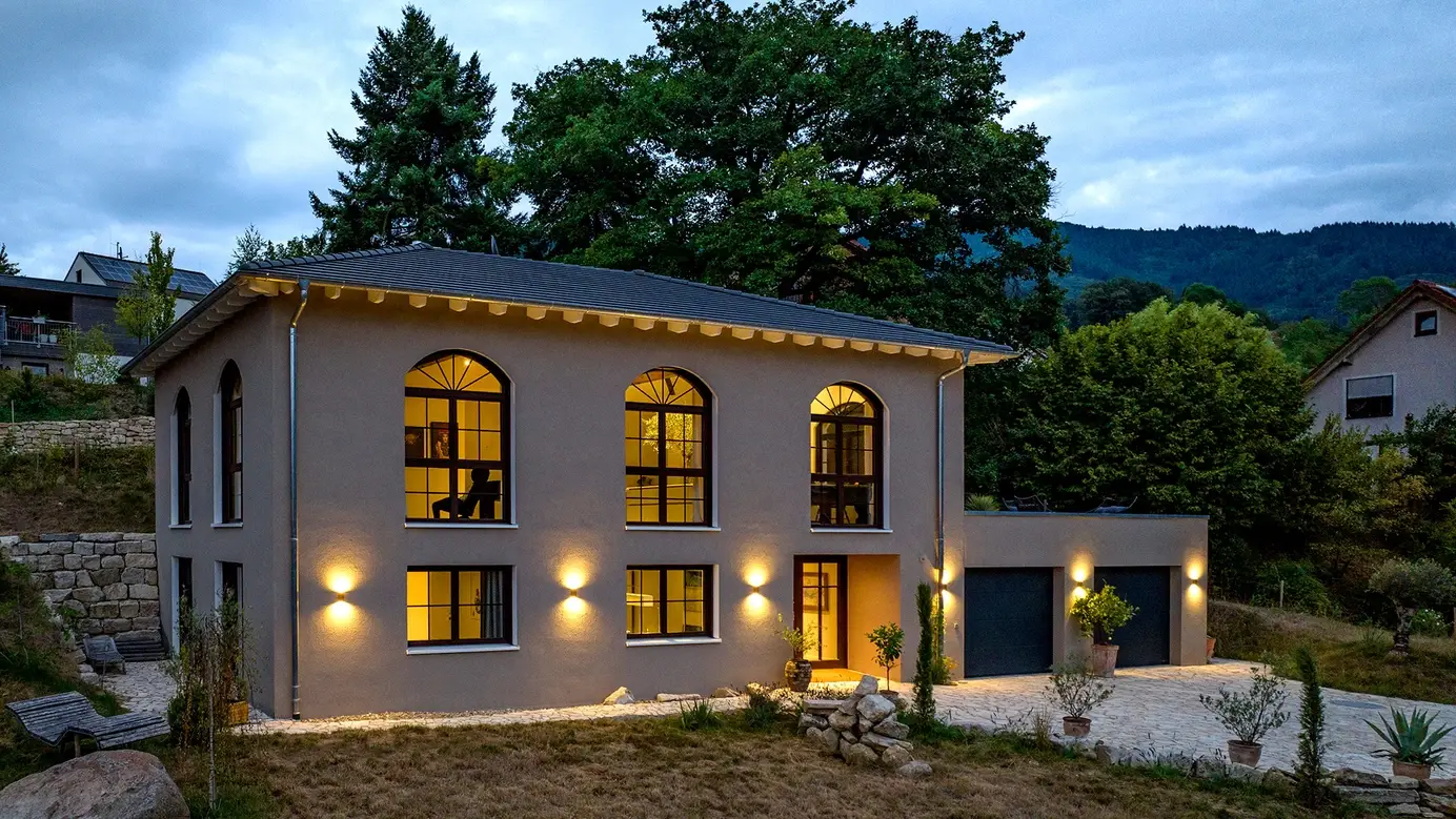 Haus Hellmann erinnert mit seinem ganz besonderen Design an eine römische Villa. Hohe Fenster mit Rundbögen, ein flaches Walmdach und Terracotta-Töne versetzen den Betrachter sofort in die Toskana. Das Erdgeschoss betritt man durch den leicht eingerückten Haupteingang oder die Doppelgarage, welche auch Platz für Werkstatt und Technikraum bietet. Über die geräumige Diele und einen Flur erreicht man Arbeits- und Schlafzimmer sowie das 14 m² große, voll ausgestattete Bad. Eine offene Treppe führt ins Obergeschoss, das mit einem gewaltigen Wow-Effekt überrascht. Raumhöhe bis unters Dach, beeindruckende Holzbalkenkonstruktion und fast 100 m² offene Fläche lassen Besucher Staunen und Schwärmen zugleich. Eine großzügige Küche und viel Platz für persönliche Ideen machen das Obergeschoss zum wahren Wohntraum.