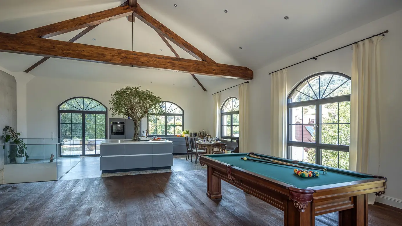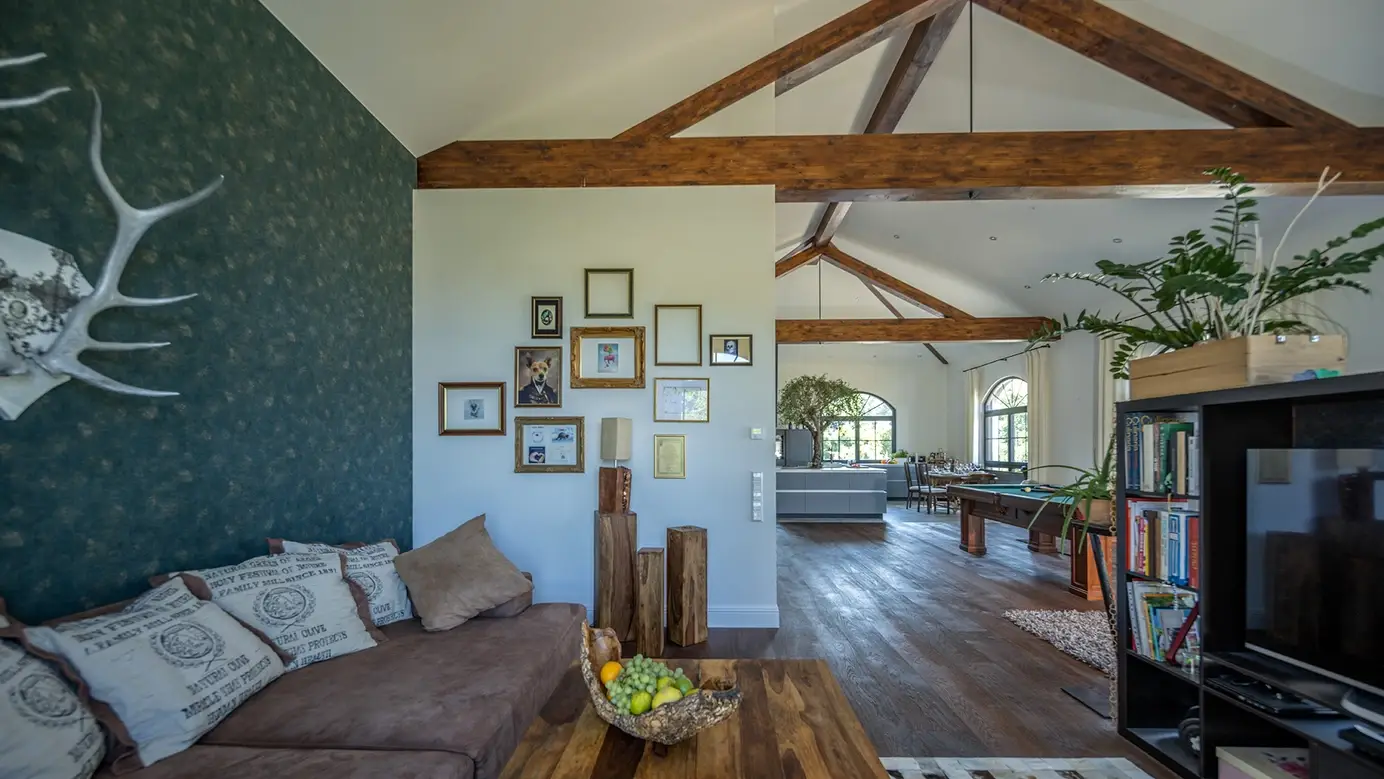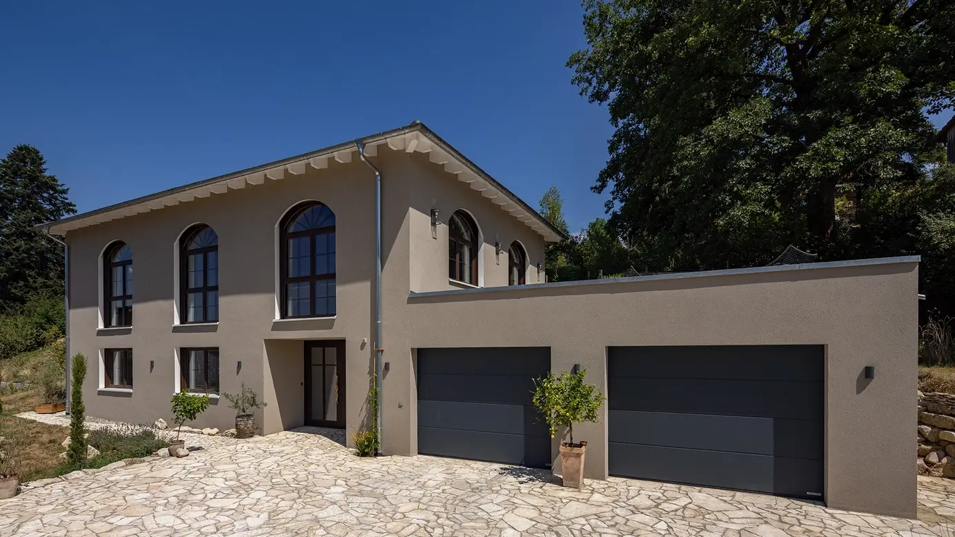 Haus Hellmann erinnert mit seinem ganz besonderen Design an eine römische Villa. Hohe Fenster mit Rundbögen, ein flaches Walmdach und Terracotta-Töne versetzen den Betrachter sofort in die Toskana. Das Erdgeschoss betritt man durch den leicht eingerückten Haupteingang oder die Doppelgarage, welche auch Platz für Werkstatt und Technikraum bietet. Über die geräumige Diele und einen Flur erreicht man Arbeits- und Schlafzimmer sowie das 14 m² große, voll ausgestattete Bad. Eine offene Treppe führt ins Obergeschoss, das mit einem gewaltigen Wow-Effekt überrascht. Raumhöhe bis unters Dach, beeindruckende Holzbalkenkonstruktion und fast 100 m² offene Fläche lassen Besucher Staunen und Schwärmen zugleich. Eine großzügige Küche und viel Platz für persönliche Ideen machen das Obergeschoss zum wahren Wohntraum.