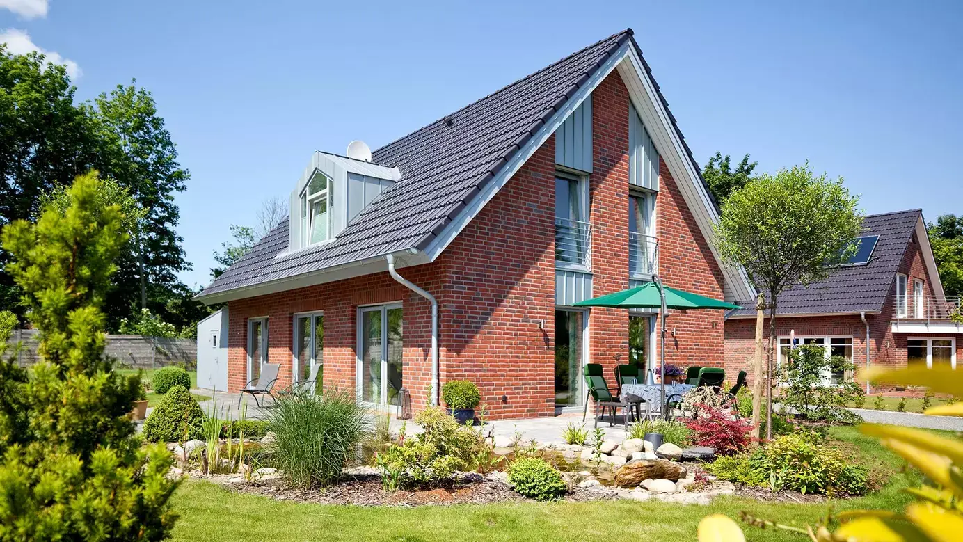 Moderne Elemente kombiniert mit ländlicher Tradition prägen den äußeren Eindruck in der Fassadengestaltung. Zinkstehfalzakzente in Giebel, Schornstein und Gaube verhelfen zu einem unverwechselbaren Erscheinungsbild. Der ländliche Charakter wird hier gekonnt ergänzt und den Ansprüchen unserer Zeit angepasst. So auch die großzügigen Fensterflächen, die in modernen Formaten sowohl attraktiv von außen anzusehen sind, als auch im Inneren den ganzen Tag Licht bescheren.