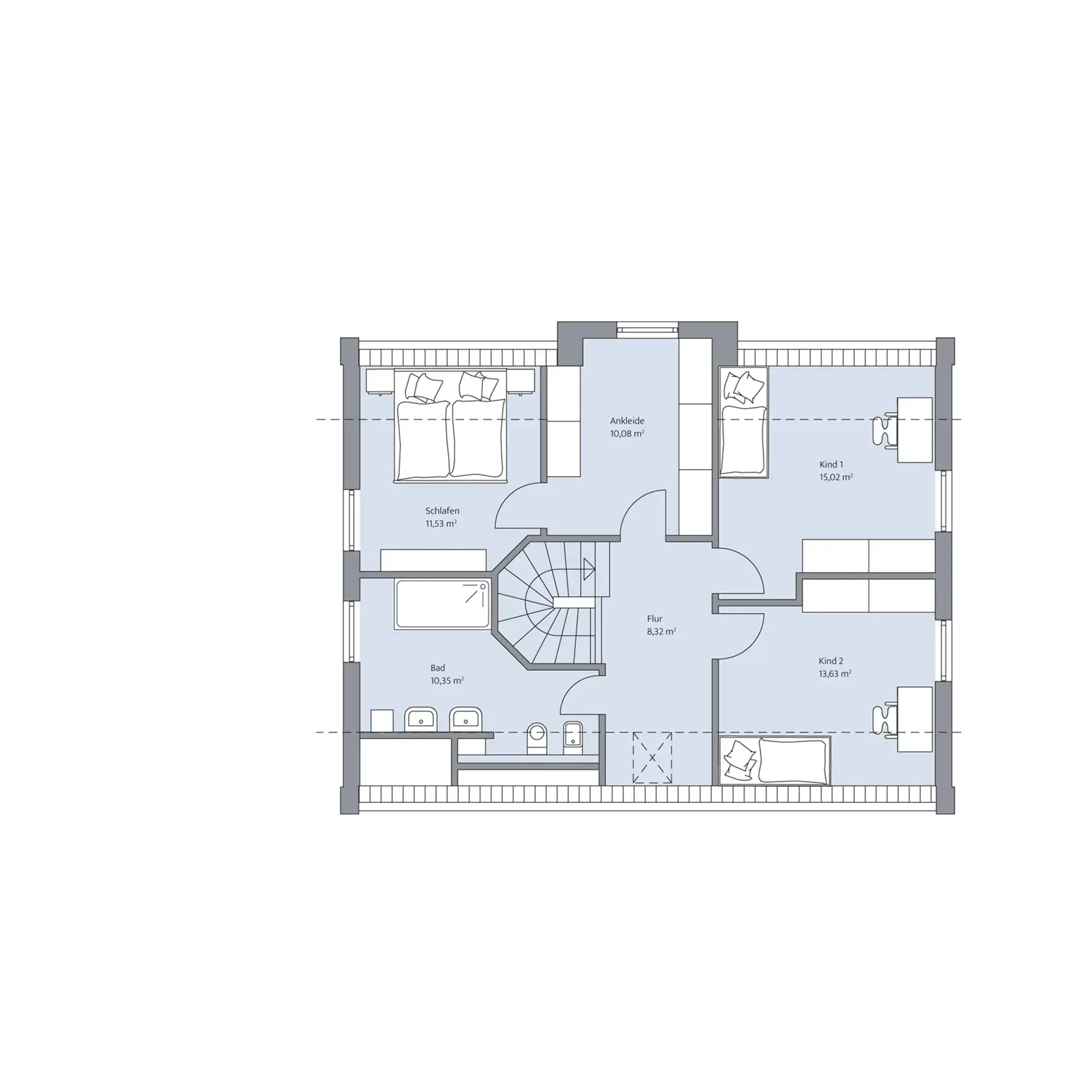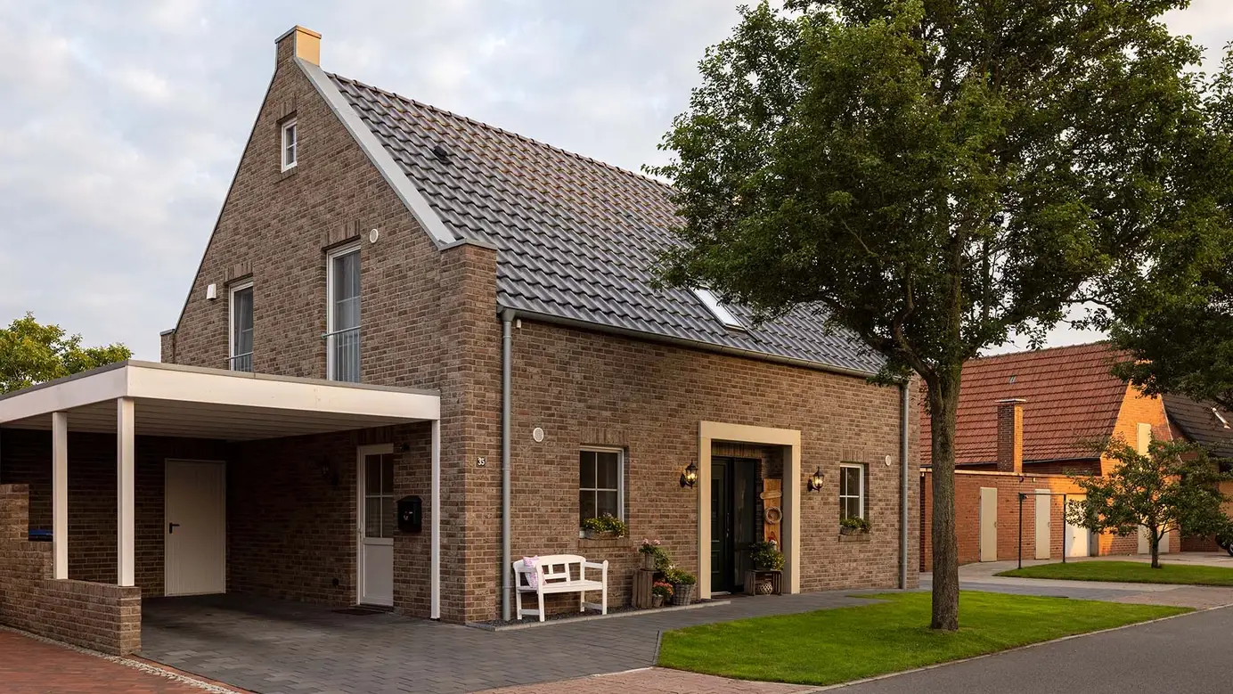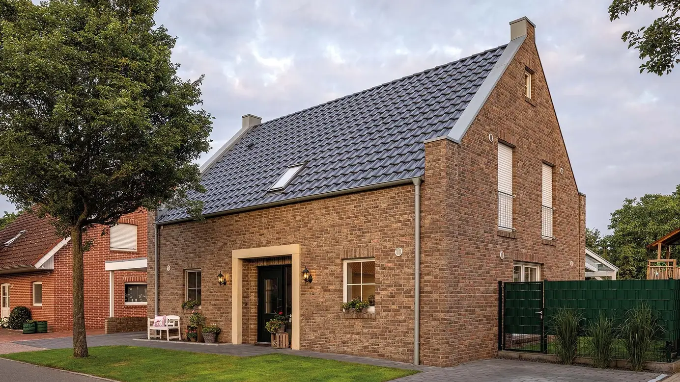 Das klassische Haus Junker mit seinen klaren Linien, dem imposanten Zwerchgiebel, den farblich changierenden Verblendsteinen und der grünen Landhaustür ist Wohngefühl pur. Vier Personen genießen hier den Platz auf 137 m² Wohnfläche, verteilt auf Erdgeschoss und Dachgeschoss. Ausreichend Raum in einem Haus, das auch auf kleineren Grundstücken realisierbar ist. Hinzu kommen ein Carport und ein außenliegender Abstellraum, der auch vom Garten aus zugänglich ist. Das Erdgeschoss kann durch die Haustür oder direkt durch den Carport betreten werden. Es umfasst einen Hauswirtschaftsraum, eine offene Küche und einen Wohn-/Essbereich mit Gartenzugang. Ein Kaminofen, ein Gäste-WC sowie die geschwungene, im modernen Grau gehaltene Treppe hinauf ins Dachgeschoss runden die untere Etage ab. Oben befinden sich zwei Kinderzimmer, das Familienbad sowie das Elternschlafzimmer mit separatem Ankleideraum.