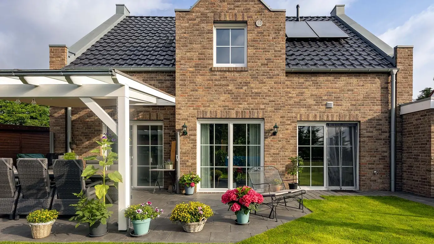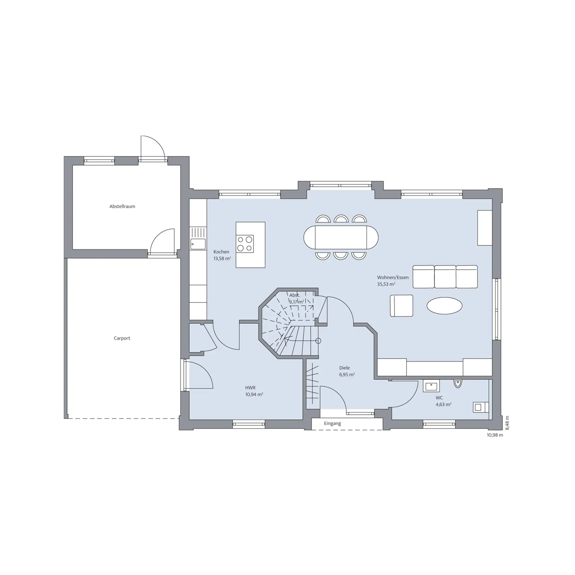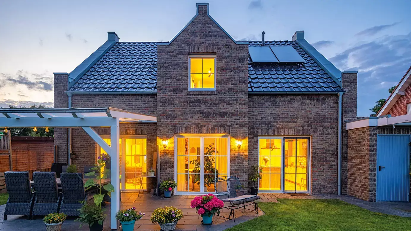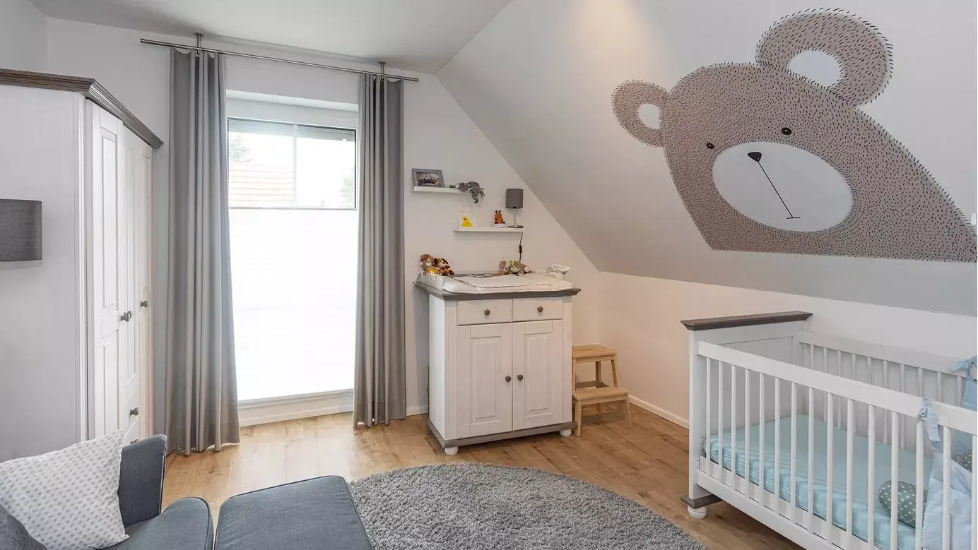 Das klassische Haus Junker mit seinen klaren Linien, dem imposanten Zwerchgiebel, den farblich changierenden Verblendsteinen und der grünen Landhaustür ist Wohngefühl pur. Vier Personen genießen hier den Platz auf 137 m² Wohnfläche, verteilt auf Erdgeschoss und Dachgeschoss. Ausreichend Raum in einem Haus, das auch auf kleineren Grundstücken realisierbar ist. Hinzu kommen ein Carport und ein außenliegender Abstellraum, der auch vom Garten aus zugänglich ist. Das Erdgeschoss kann durch die Haustür oder direkt durch den Carport betreten werden. Es umfasst einen Hauswirtschaftsraum, eine offene Küche und einen Wohn-/Essbereich mit Gartenzugang. Ein Kaminofen, ein Gäste-WC sowie die geschwungene, im modernen Grau gehaltene Treppe hinauf ins Dachgeschoss runden die untere Etage ab. Oben befinden sich zwei Kinderzimmer, das Familienbad sowie das Elternschlafzimmer mit separatem Ankleideraum.