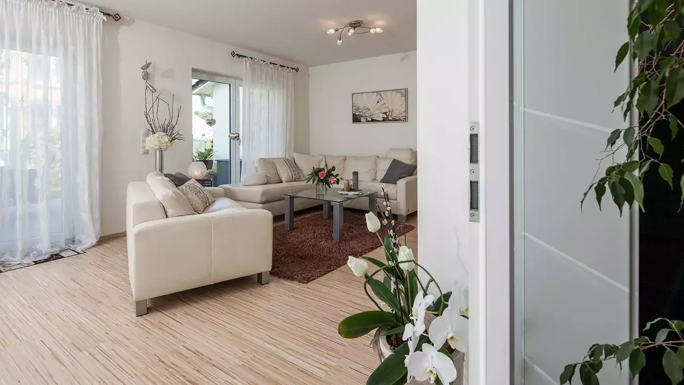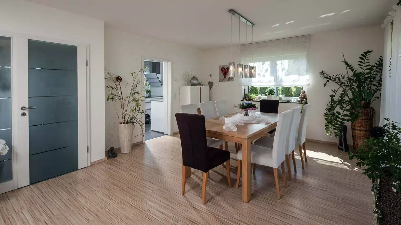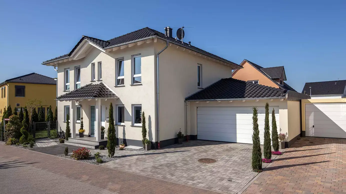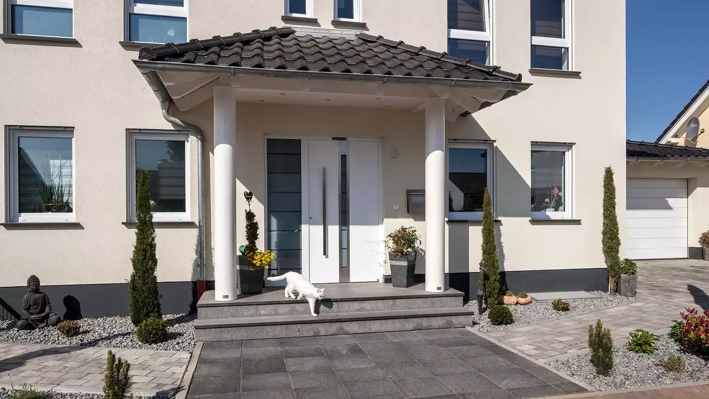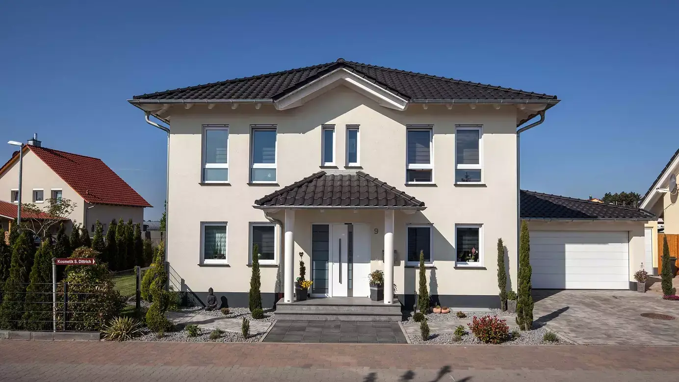 Haus Lindner ist eine repräsentative Stadtvilla im mediterranen Stil, ideal für eine vierköpfige Familie. Das Haus kombiniert mediterrane Architektur und traditionelle Stilelemente mit zeitgemäßen Akzenten. Dazu gehören schlanke, elegante Fenster mit asymmetrischen Sprossen, große Glasflächen in Richtung Garten und ein modernes Eingangselement, das eine harmonische Verbindung mit dem traditionellen Walmdach mit seinen sichtbaren Pfettenköpfen und weißen Dachuntersichten eingeht. Innen bietet die Stadtvilla behagliches Wohnen der gediegenen Art: Der Wohnbereich und Essplatz sind zu einer knapp 38 m² großen Einheit zusammengefasst, die sich zum Garten hin über große Glasflächen öffnet. Die Küche ist klassisch als separater Raum konzipiert. Im Obergeschoss machen Fenster auf allen Hausseiten großzügiges Wohnen ohne Dachschrägen möglich. Zeitgemäße Details setzen dabei das Kinderbad und ein separater Elterntakt, der aus einem 14 m² großen Schlafraum mit Blick in den Garten, einer Ankleide und einem modernen Wohnbad inklusive Whirlpool besteht.