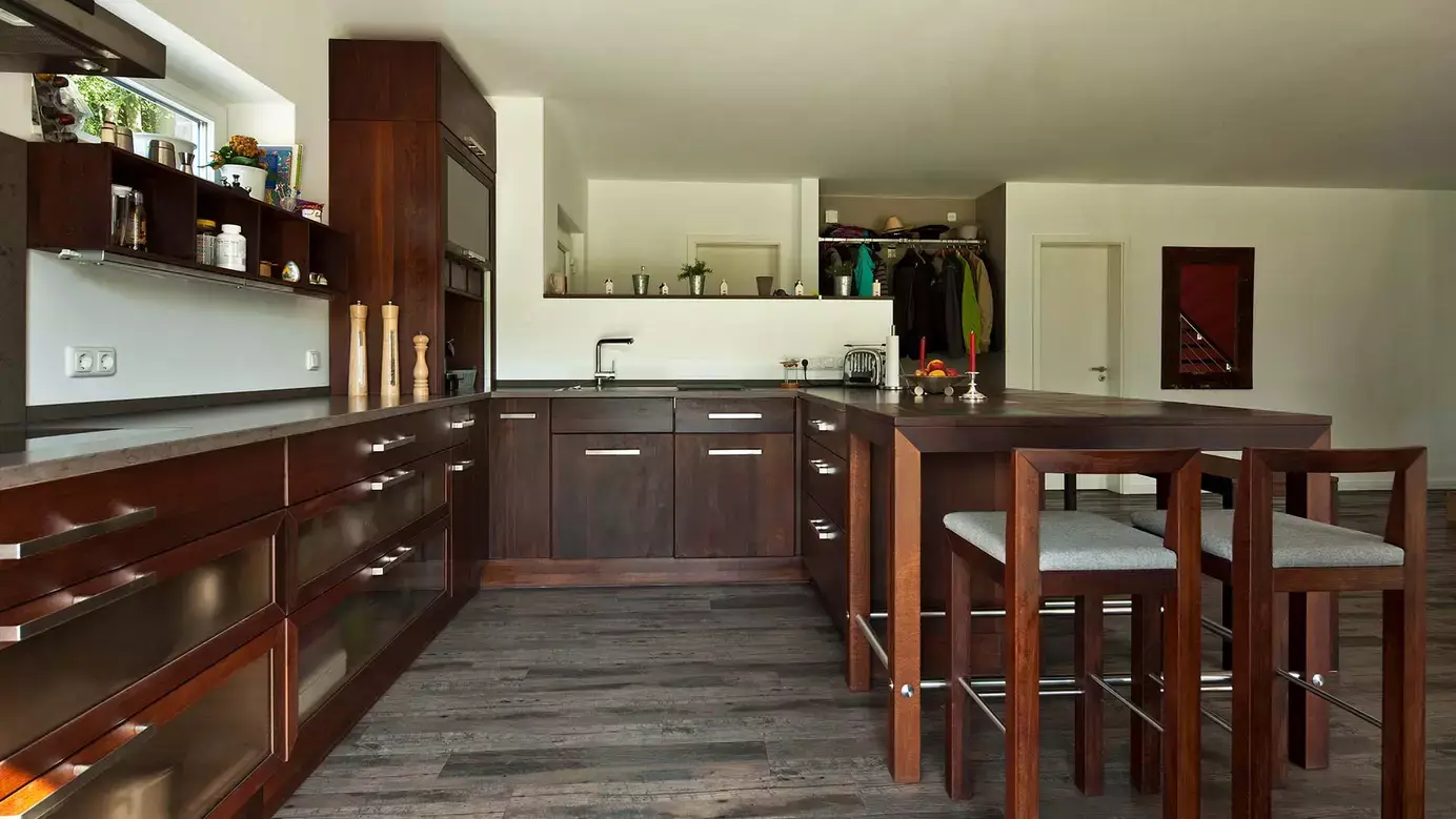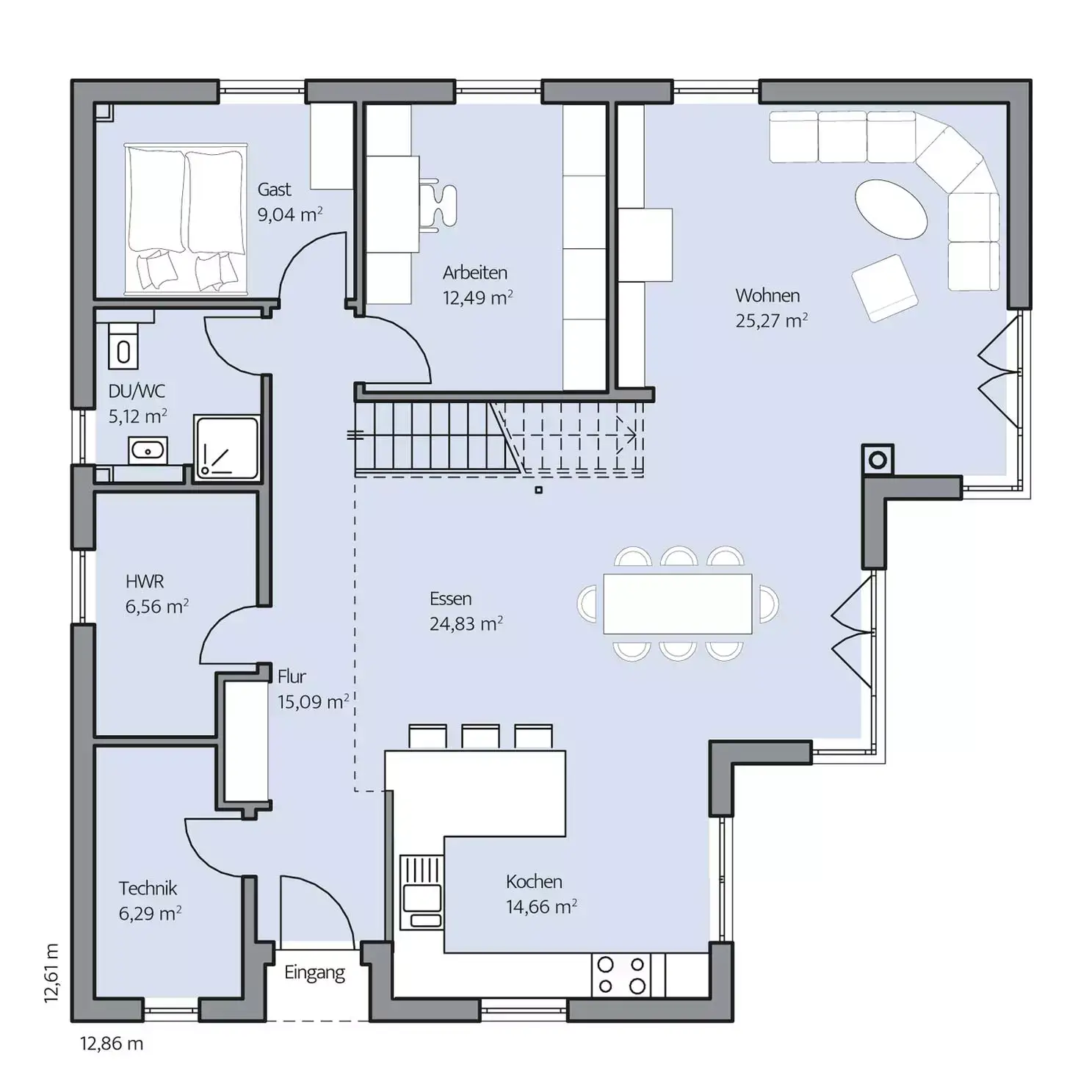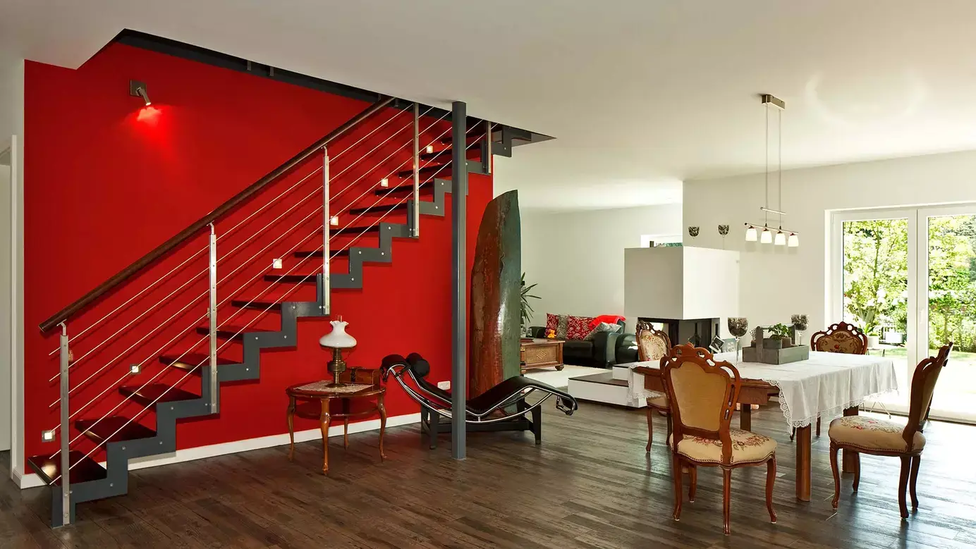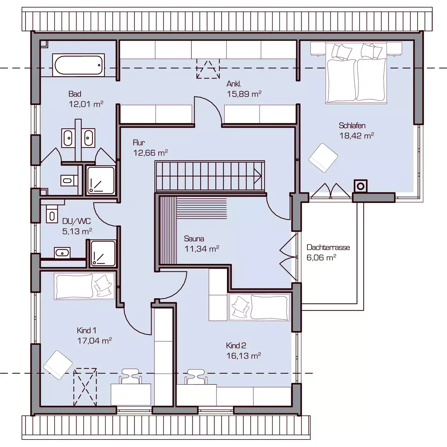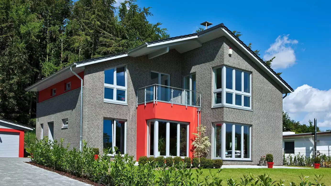 Was für eine Hausfront: Modische anthrazithfarbene Klinker mit ausgewählten Elementen in rot, große Fensterflächen, teils über Eck, und in der Mitte ein hochmoderner Erker, der dem Obergeschoss als Terrasse dient – auf die man nicht nur vom Schlafzimmer, sondern auch von der hauseigenen Sauna aus kommt. Im Haus der Familie Nelsen werden klassische Formen und Aufteilungen ganz neu interpretiert. Sei es im Koch-, Ess- und Wohnbereich, der fließend ineinander übergeht oder im Ankleidezimmer im Dachgeschoss, von dem man ins Schlafzimmer gelangt oder ins moderne Bad. Dieses haben die Eltern ganz für sich alleine, denn der Nachwuchs hat seinen eigenen WC- und Duschbereich. So lebt es sich familiengerecht und hochmodern zugleich.