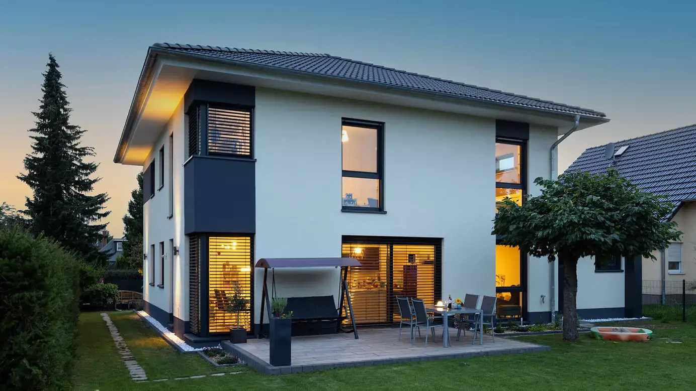 Diese klassische Stadtvilla vereint klassischen Stil mit funktionaler Eleganz und ist ideal für Familien. Die zweigeschossige Villa bietet auf 177 m² eine harmonische Symbiose aus Massivbauweise und modernen Wohnansprüchen. Die äußere Eleganz des Hauses wird durch die kubische Formensprache mit klaren Linien und strukturierter Ordnung unterstrichen. Der überdachte Eingangsbereich und die integrierte Garage bieten einen farblichen und architektonischen Kontrast, der die Eleganz der Hauptfassade betont und die Funktionalität des Außenbereichs erhöht. Das großzügige Erdgeschoss umfasst einen Wohn-/Essbereich von fast 29 m² mit beeindruckender Eckverglasung, eine fast 13 m² große Küche, einen separaten Arbeitsbereich sowie ein Gästezimmer. Anthrazitfarbene Golden Oak Kunststofffenster sorgen für ein luxuriöses Erscheinungsbild, das sich durch alle Räume zieht. Eine elegante weiße Holzwangentreppe mit Galeriegeländer verbindet die Etagen. Im Obergeschoss finden sich private Rückzugsorte, die Ruhe und Erholung bieten. Der Elternschlafbereich umfasst über 13 m², nebenan ein luxuriös ausgestattetes Badezimmer. Drei weitere Zimmer bieten flexible Nutzungsmöglichkeiten. Das Haus Öhlschläger steht auch für nachhaltige Bauweise durch die Verwendung energieeffizienter Materialien und Technologien wie Fußbodenheizung, die die Betriebskosten reduzieren. Die clevere Raumaufteilung und hochwertige Innenausstattung schaffen eine sowohl ästhetisch ansprechende als auch praktisch lebenswerte Umgebung.