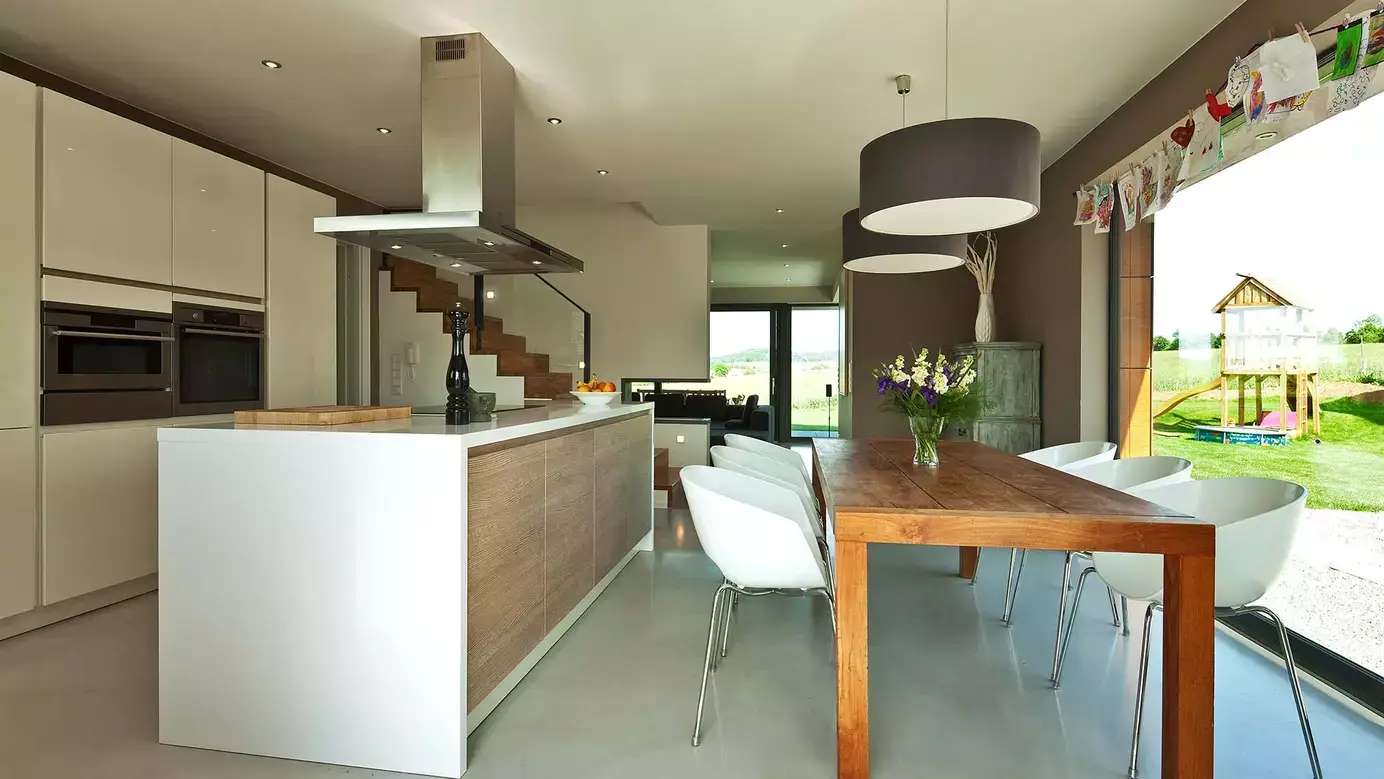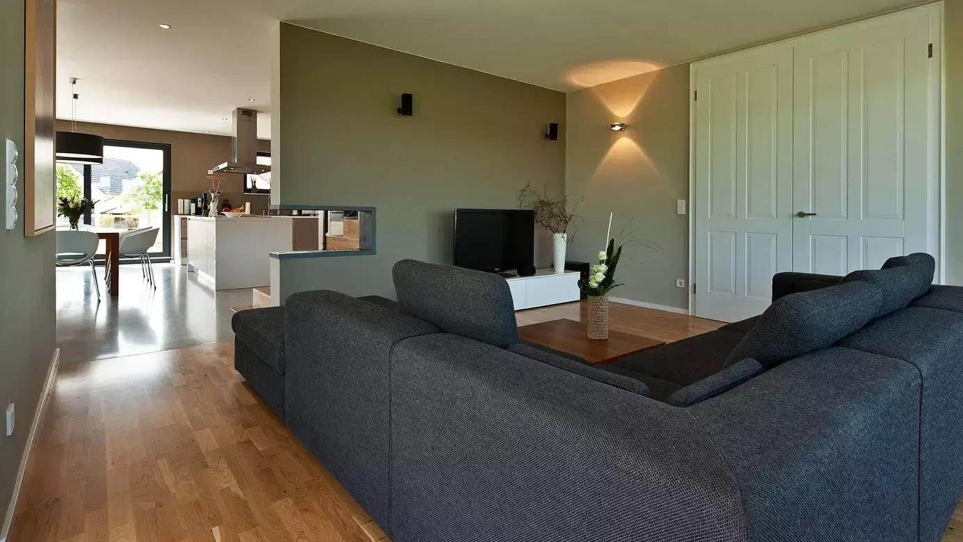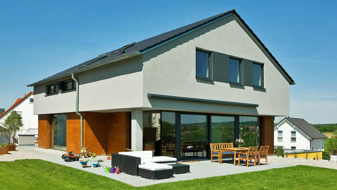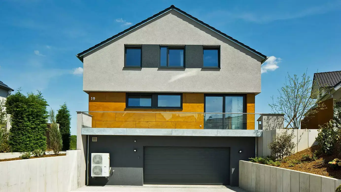 Keine Frage, das Haus von Familie Ohlig fällt auf. Hebt es sich doch in so vielen Punkten vom Mainstream zeitgenössischer Architektur ab und bietet so seinen Bewohnern einen rundum passenden, individuellen Wohnkomfort. Dieses Unikat strahlt mit seinen minimalen Dachüberständen und der schlichten Linienführung schnörkellosen Purismus aus. Oben unterbrechen Fensterreihen mit schwarzen Putzflächen den Giebel, unten durchbrechen sie Symmetrieachsen und erzeugen so doch ein absolut stimmiges Bild. Darin fügt sich auch der Kontrast durch die Holzfunierverkleidung ein, den man so sicherlich nicht erwartet hätte. Auf der Süd- und Westseite des Hauses ermöglichen geschützte Freiflächen ein aktives Leben im Freien und bewirken zusätzlich eine im Sommer wohltuende Beschattung. Die Räume auf insgesamt rund 194 m² Wohnfläche sind in extrovertierte Kommunikationsbereiche und introvertierte Rückzugsbereiche unterteilt. Viel Platz und die offene Gestaltung laden zum Durchatmen ein. Und auch das über ein geradläufiges Faltwerk mit Geländer erschlossene Obergeschoss präsentiert sich als durchgeplante Ebene. Ein Elternschlafzimmer, drei gut geschnittene Kinderzimmer sowie zwei Bäder finden hier Platz.