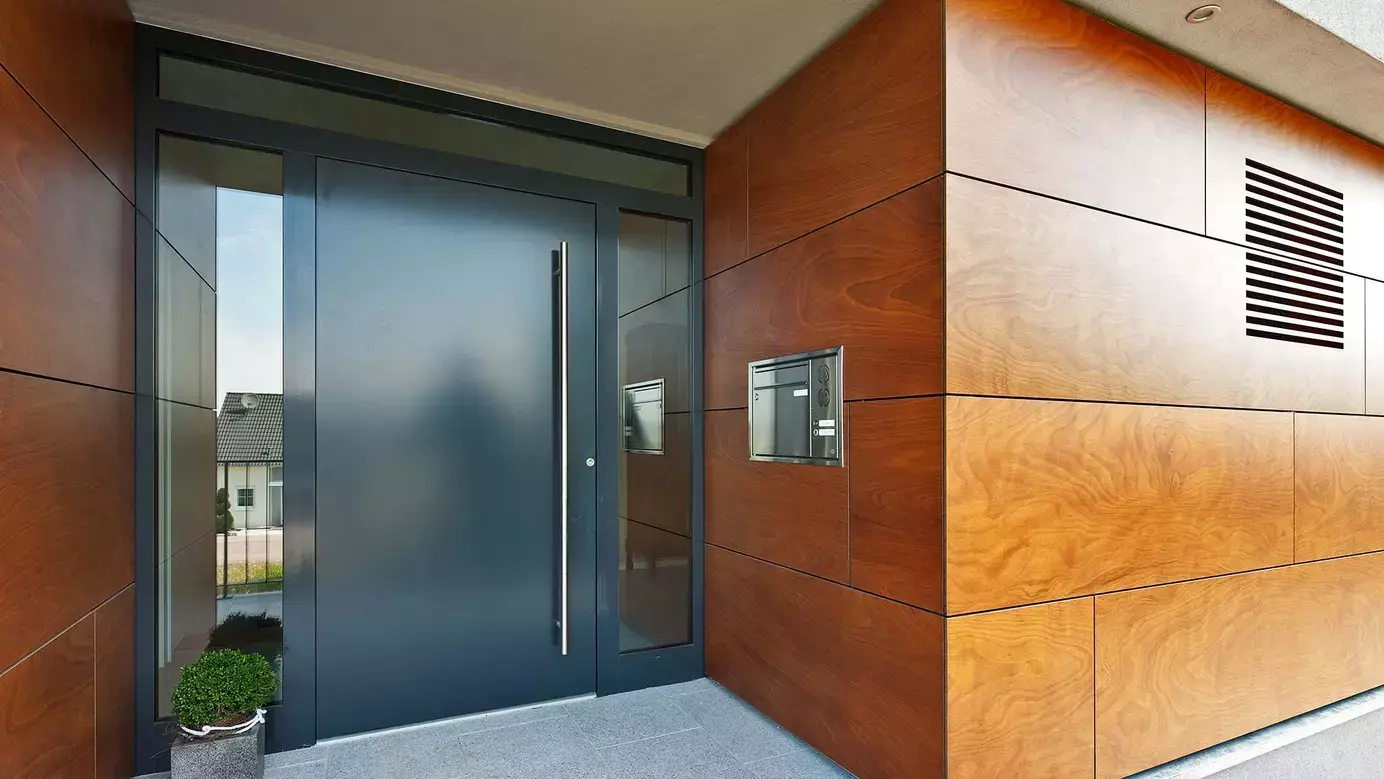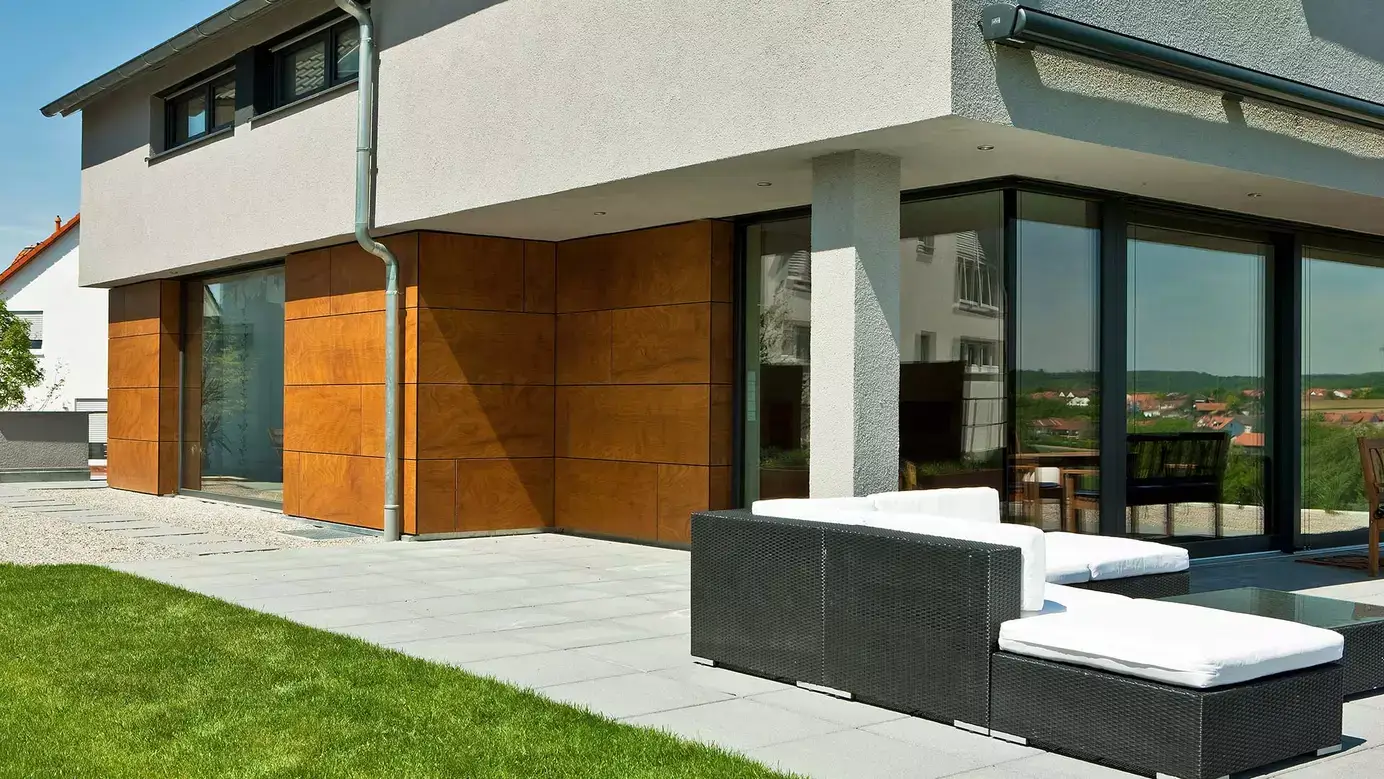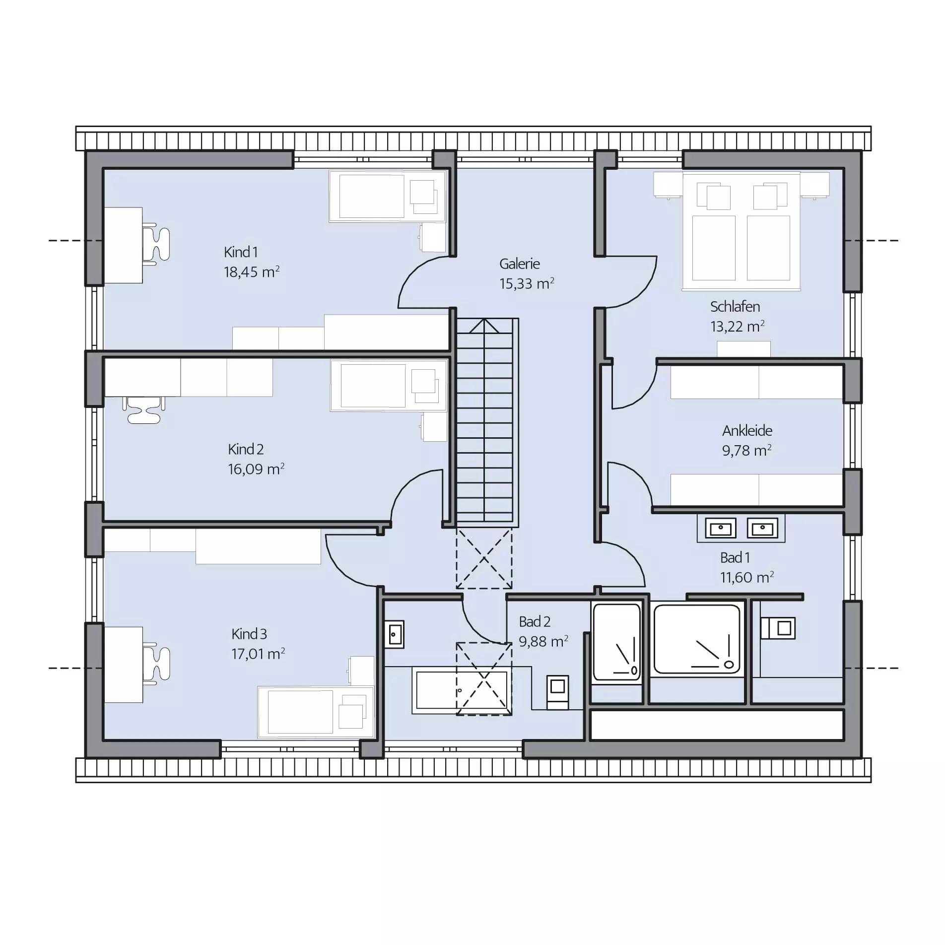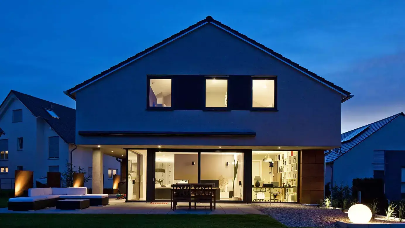 Keine Frage, das Haus von Familie Ohlig fällt auf. Hebt es sich doch in so vielen Punkten vom Mainstream zeitgenössischer Architektur ab und bietet so seinen Bewohnern einen rundum passenden, individuellen Wohnkomfort. Dieses Unikat strahlt mit seinen minimalen Dachüberständen und der schlichten Linienführung schnörkellosen Purismus aus. Oben unterbrechen Fensterreihen mit schwarzen Putzflächen den Giebel, unten durchbrechen sie Symmetrieachsen und erzeugen so doch ein absolut stimmiges Bild. Darin fügt sich auch der Kontrast durch die Holzfunierverkleidung ein, den man so sicherlich nicht erwartet hätte. Auf der Süd- und Westseite des Hauses ermöglichen geschützte Freiflächen ein aktives Leben im Freien und bewirken zusätzlich eine im Sommer wohltuende Beschattung. Die Räume auf insgesamt rund 194 m² Wohnfläche sind in extrovertierte Kommunikationsbereiche und introvertierte Rückzugsbereiche unterteilt. Viel Platz und die offene Gestaltung laden zum Durchatmen ein. Und auch das über ein geradläufiges Faltwerk mit Geländer erschlossene Obergeschoss präsentiert sich als durchgeplante Ebene. Ein Elternschlafzimmer, drei gut geschnittene Kinderzimmer sowie zwei Bäder finden hier Platz.