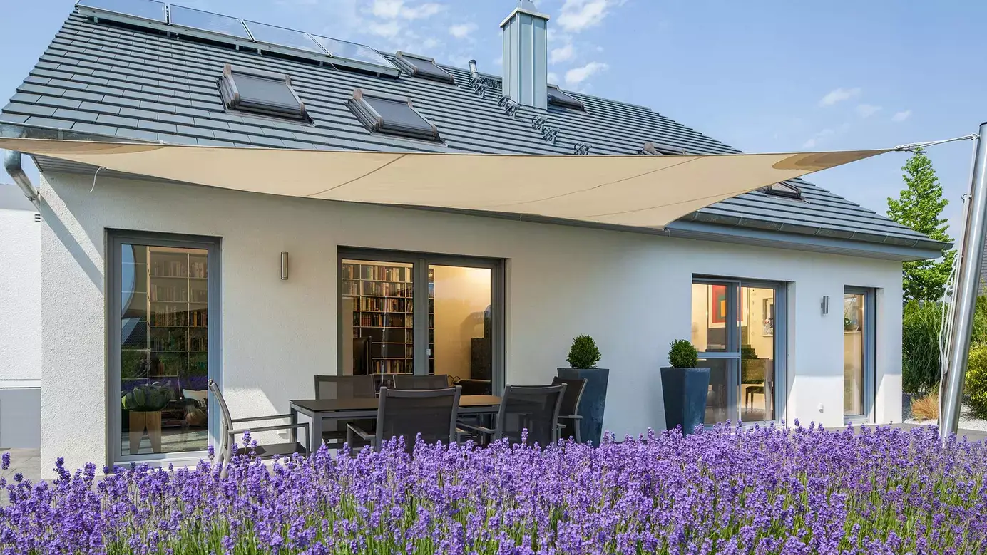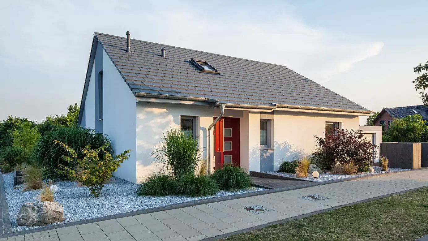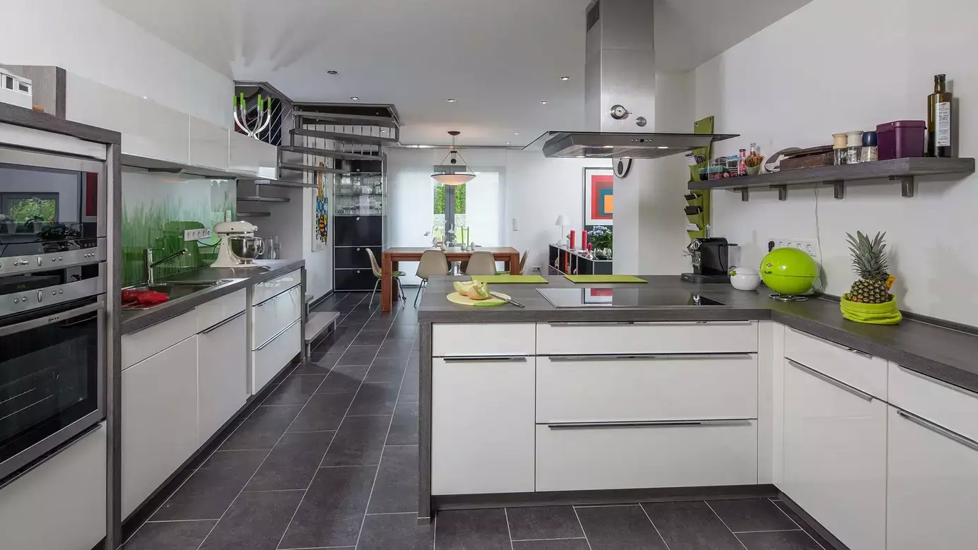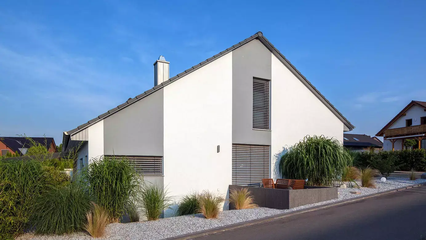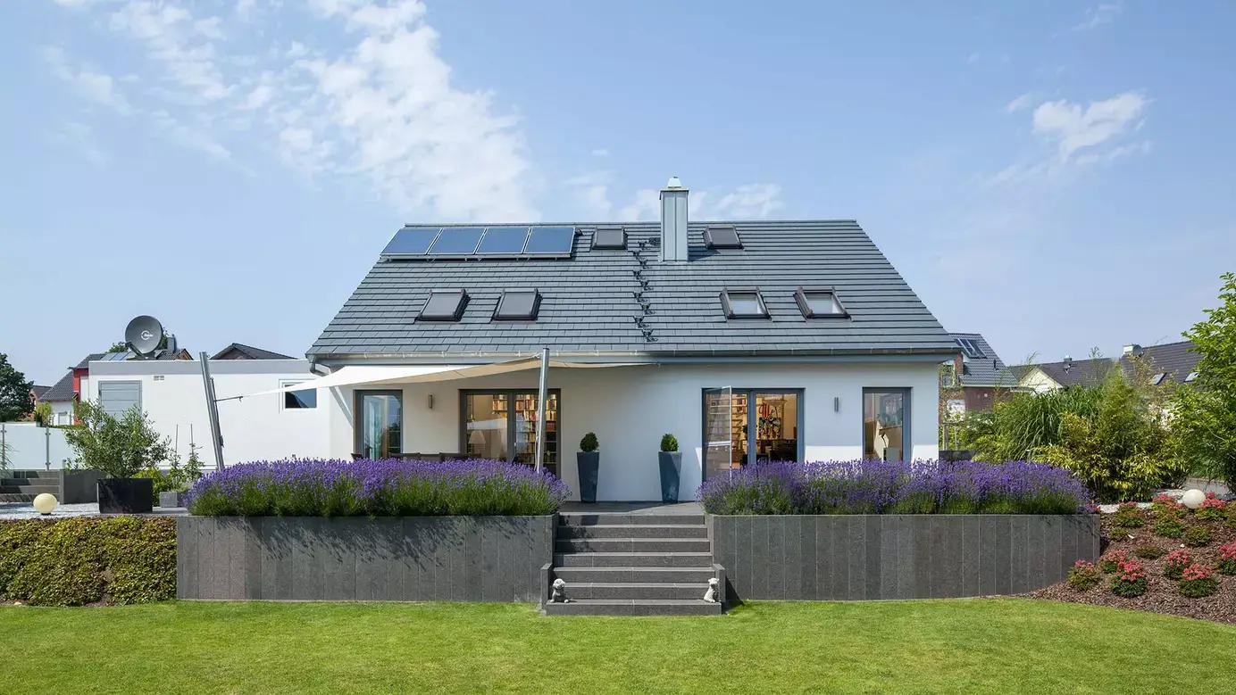 Das klassische Satteldachhaus der Familie Opitz überzeugt auf einer Grundfläche von rund 12 x 12 m mit einem eleganten Farbkonzept und einer zeitgemäße Formgebung. Die Giebelseiten zieren französische Balkone sowie moderne Lichtbänder im Erdgeschoss, an der Westseite des Hauses befindet sich eine Terrasse mit zweiflügeliger Glastür. Die Hanglage des Hauses wurde durchdacht für eine Split-Level-Bauweise genutzt. Das Erdgeschoss überrascht direkt auf den ersten Blick mit einer angenehmen Luftigkeit. Hier finden eine Diele, der an die 30 m² große Küche angegliederte Essbereich, ein Arbeits- oder Gästezimmer mit Dusch-WC, der Technikraum sowie – hochmodern drei Stufen tiefer gelegen – eine 39 m² große Wohnfläche mit Sitz- und Lesenische sowie Kaminofen ihren Platz. Eine bis unter das Dach offene Decke sorgt für Weite, der direkte Zugang zur Terrasse ebenso. Im Obergeschoss befinden sich in gemütlicher Atmosphäre an die Galerie angegliedert ein Schlafzimmer, eine große Ankleide sowie ein komfortables Badezimmer.