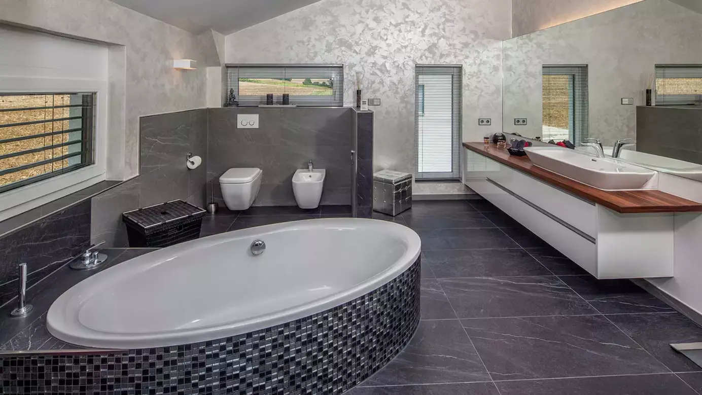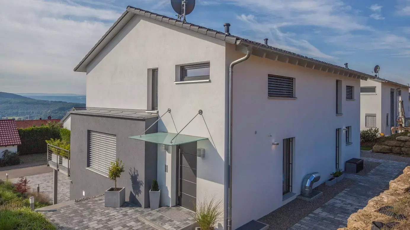 Mit seinem schlankem Baukörper und zwei Vollgeschossen eignet sich Haus Philipp zum Beispiel für eine Lückenbebauung im urbanen Bereich oder für Hanggrundstücke mit Süderschließung. Für zwei Personen geplant, hält das Haus einen weiträumigen Wohnbereich mit Ausblick und jede Menge Komfort bereit. Dem Hauseingang gegenüber führt eine geradläufige Treppe hinauf ins Obergeschoss, links geht es durch einen offenen Eingang in das ca. 67,5 m² große Wohnensemble. Die Funktionsbereiche staffeln sich längs des Baukörpers, dessen Blickachsen einen weiten, luftigen Raumeindruck vermitteln. Wie es dem Geschmack der Zeit entspricht, ist der Essplatz als kommunikatives Zentrum der Diele zugeordnet, so dass hier alle Wege im Haus zusammenlaufen. Die Sitzecke liegt in einer gemütlichen Nische mit Aussicht und hat einen direkten Zugang zum Freisitz neben dem Haus. Das Obergeschoss ist für ein allein lebendes Paar ausgelegt. Bei Außenmaßen von 8,86 x 13,36 m und einer zweigeschossigen Bauweise gibt es auf dieser Ebene also reichlich Spielraum für komfortable Lösungen und praktische Reserveräume.