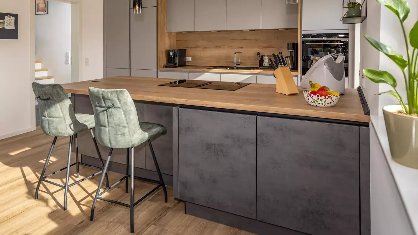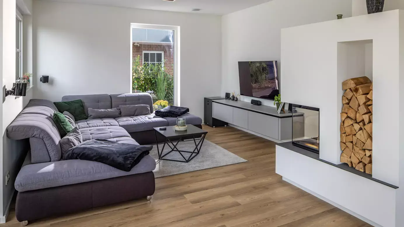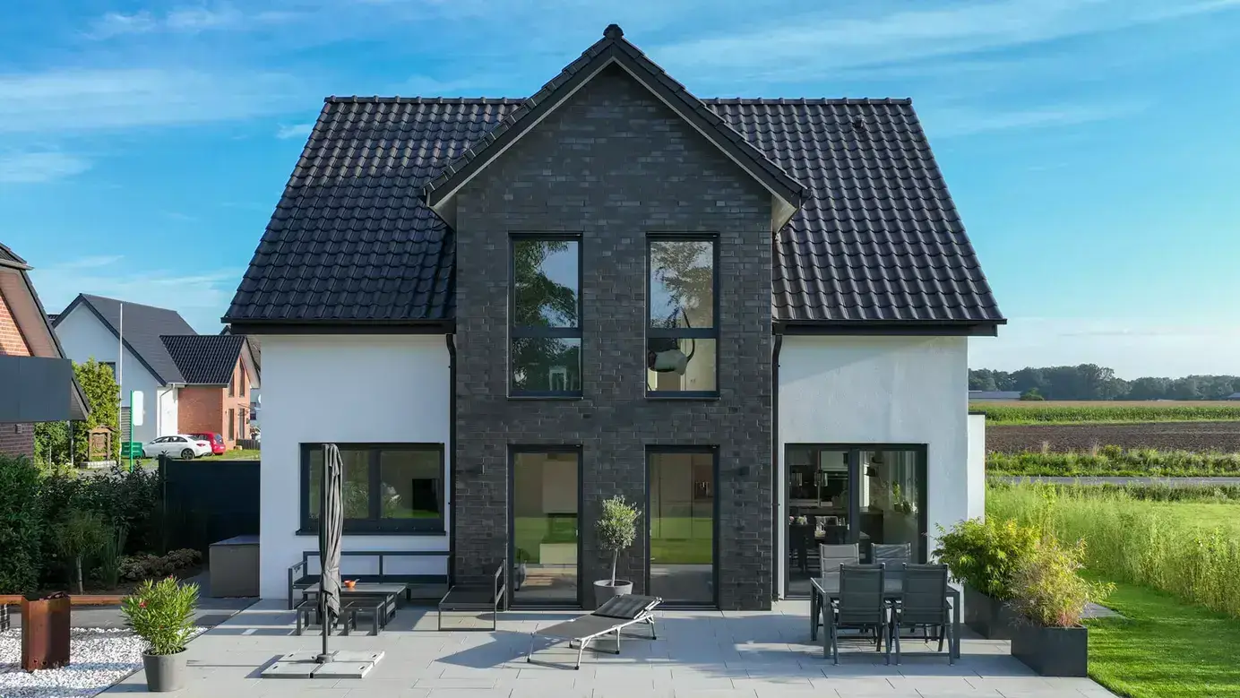 Haus Schwarz, ein klassisch-modernes Einfamilienhaus, bietet eine perfekte Mischung aus traditionellem Charme und zeitgemäßem Wohnkomfort auf einer Wohnfläche von rund 138 m² über zwei Stockwerke. Mit einer Fassade aus dunklem Klinker und hellem Putz sowie einem Satteldach und symmetrisch angeordneten, hohen Fenstern verbindet es architektonische Prägnanz mit ästhetischer Ausstrahlung. Im Erdgeschoss befindet sich der offene Wohn-/Essbereich von über 34 m², der das Zentrum des familiären Lebens darstellt. Große Fensterfronten schaffen eine Verbindung zur großzügigen Terrasse und zum Garten. Eine offene Küche, ein separates Arbeitszimmer und ein Gäste-WC komplettieren das Raumangebot. Das Obergeschoss bietet ein großzügiges Elternschlafzimmer mit Ankleide, zwei Kinderzimmer und ein modern ausgestattetes Bad. Eine Stahlbetontreppe verbindet beide Ebenen. Haus Schwarz ist als Effizienzhaus mit Erdwärmepumpe und Fußbodenheizung ausgestattet. Die 3-fach-Verglasung der Fenster unterstützt die Energieeffizienz. Im Außenbereich lädt ein Garten mit Terrasse, Pergola und modernem Swimmingpool zur Erholung ein. Eine Garage mit angrenzendem Abstellraum rundet das Angebot ab. Das Haus der Familie Schwarz steht für einen Lebensraum im Einklang mit Natur und Komfort und bietet einen idealen Rahmen für das Familienleben.