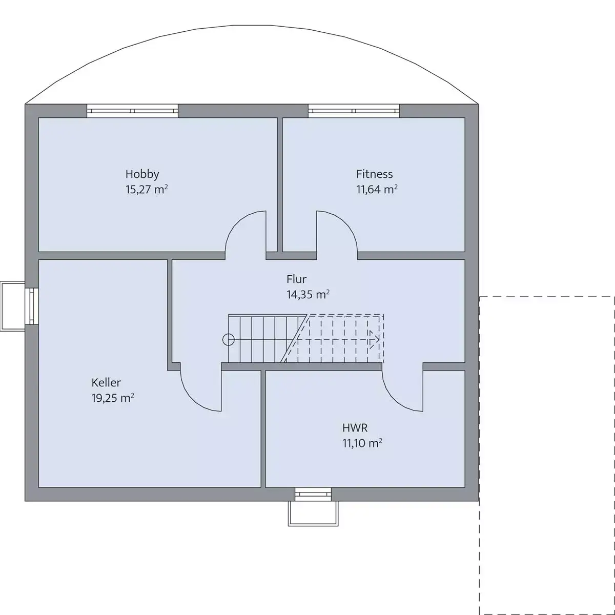 Das Satteldachhaus präsentiert sich als zeitgemäß-puristischer Entwurf mit nahezu zweigeschossiger Bauweise und 163 cm Kniestock. Das Dach mit minimalem Überstand reduziert den Baukörper auf seine geometrische Grundform. Akzente setzen moderne Accessoires wie große Glasflächen im Zusammenspiel mit liegenden Lichtbändern. Der Grundriss des Hauses wirkt sehr aufgeräumt und praktisch. Das gut gegliederte Wohnensemble, dessen Küche dank L-Form aus der Sicht des Wohnbereichs verschwindet, ist zusätzlich über eine Schiebetür abteilbar. Das Obergeschoss des Hauses bietet Individualräume für vier Personen, die rund um die zentrale Treppe angeordnet sind. Dabei sorgt der hohe Kniestock nicht nur für mehr nutzbare Wohnfläche, er ermöglicht auch die Belichtung aller Räume von zwei Seiten.