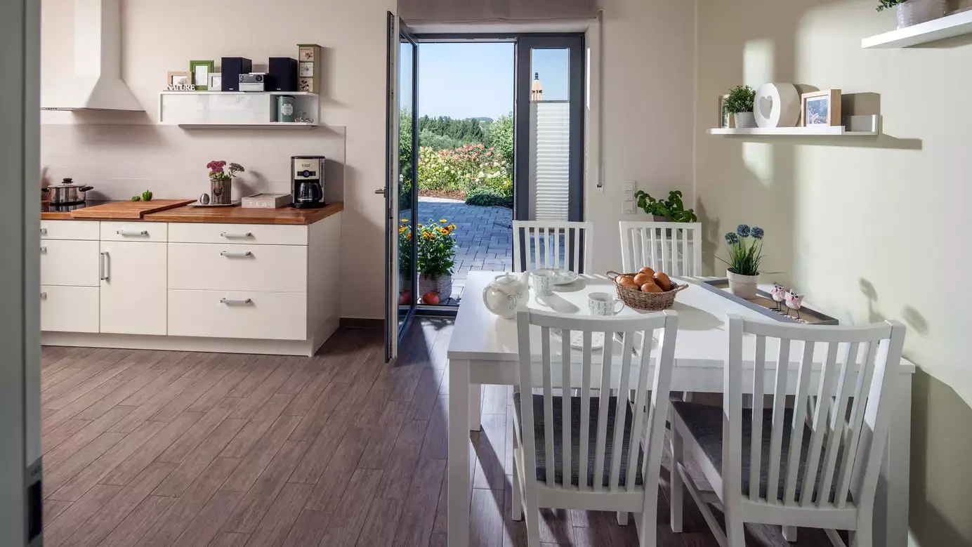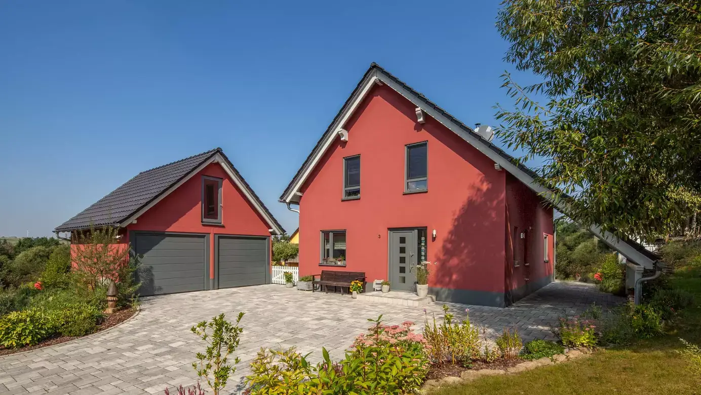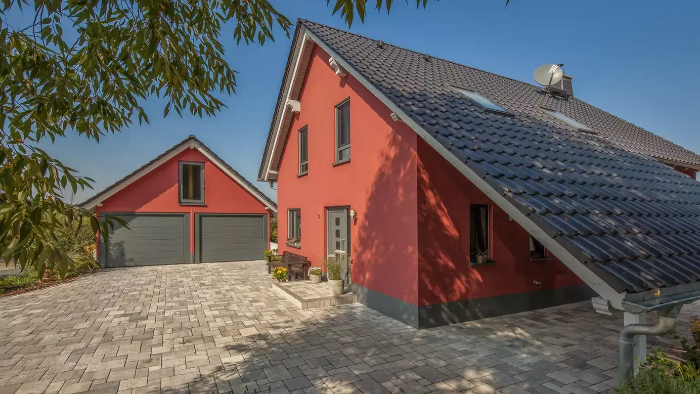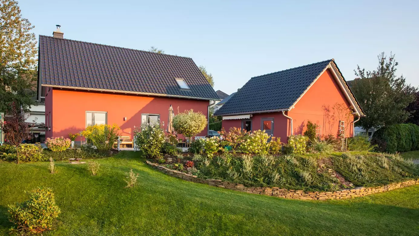 Das Haus Urban wirkt mit seiner roten Fassade und dem Satteldach auf den ersten Blick wie ein Landhaus. Doch anthrazitfarbene Tore, Türen und Fenster und französische Balkone verströmen ein elegantes Flair und machen das Objekt zu einem ganz besonderen Familiennest. Außergewöhnlich ist auch die separate, rechtwinkelig angeordnete Doppelgarage mit Satteldach, die den Stil des Wohnhauses souverän fortführt. Der Grundriss ist bewusst klassisch gehalten. Das Erdgeschoss verfügt über eine Trennung zwischen Küche und Wohnbereich mit Essplatz, die sich im Alltag oft als praktische Lösung erweist. Ein Kachelofen zwischen Wohnbereich und Essplatz sorgt für Behaglichkeit. Unterm Dach ist genügend Platz für eine vierköpfige Familie, wobei besonderes Augenmerk auf die Kinderzimmer gelegt wurde, die mit jeweils rund 12,00 m² Wohnfläche sehr geräumig sind.