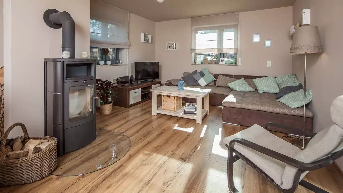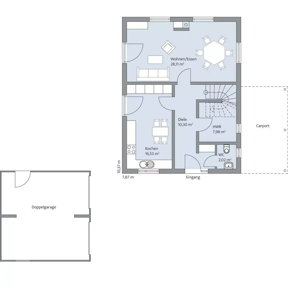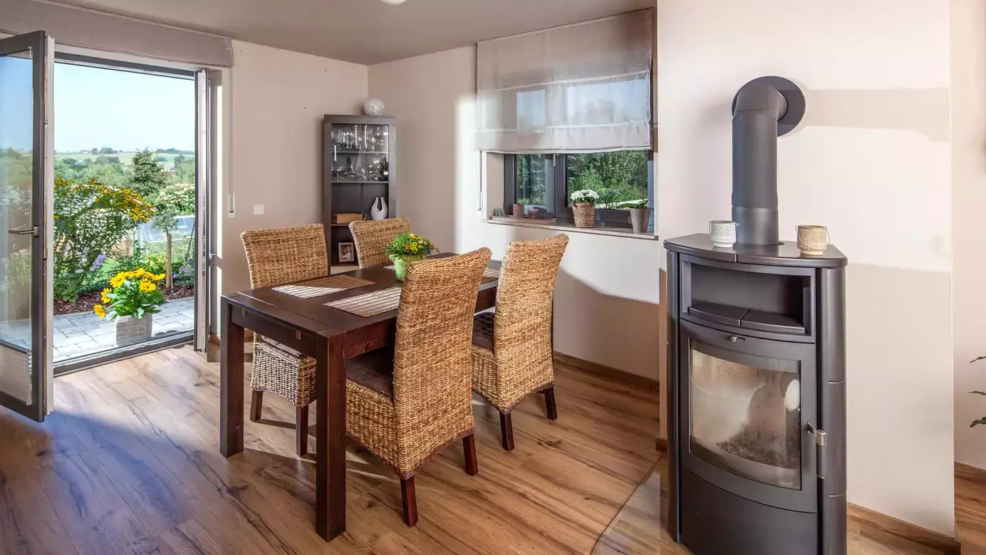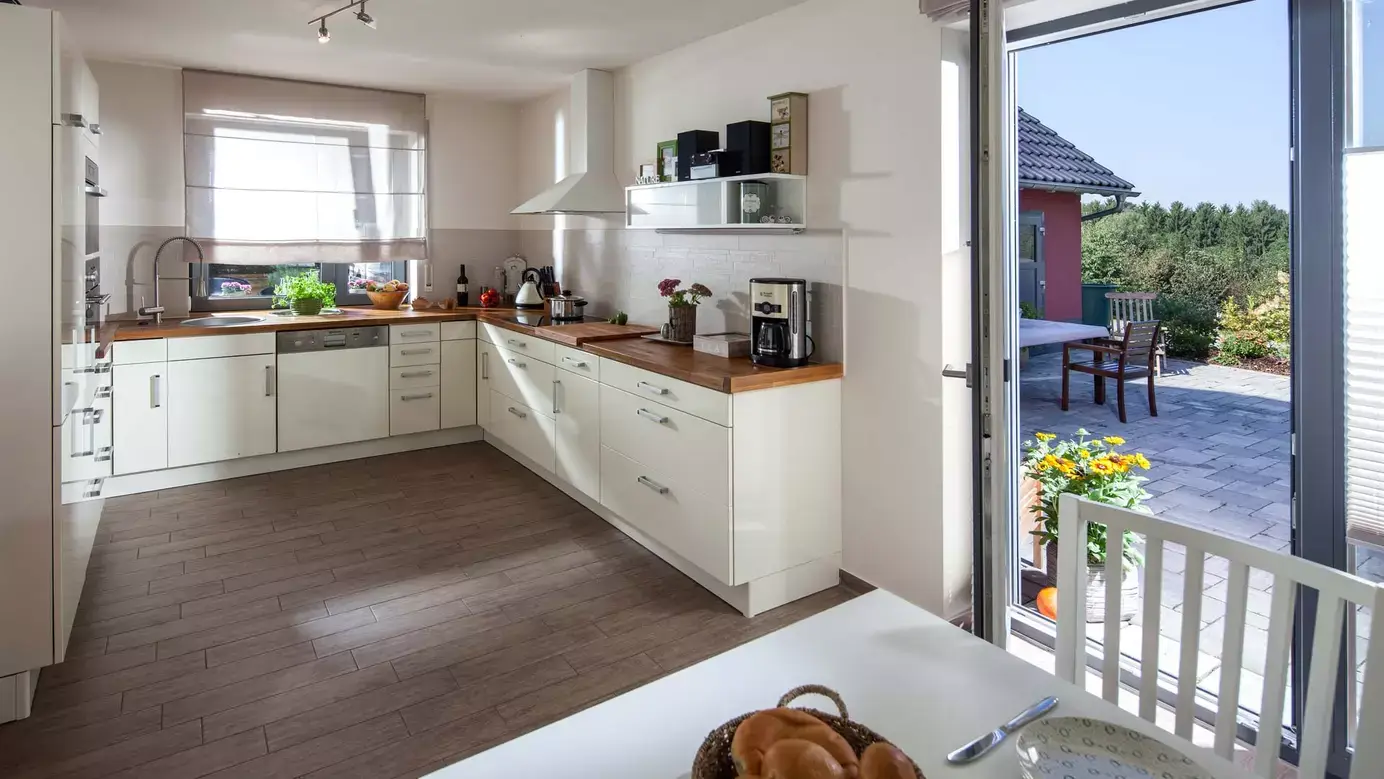 Das Haus Urban wirkt mit seiner roten Fassade und dem Satteldach auf den ersten Blick wie ein Landhaus. Doch anthrazitfarbene Tore, Türen und Fenster und französische Balkone verströmen ein elegantes Flair und machen das Objekt zu einem ganz besonderen Familiennest. Außergewöhnlich ist auch die separate, rechtwinkelig angeordnete Doppelgarage mit Satteldach, die den Stil des Wohnhauses souverän fortführt. Der Grundriss ist bewusst klassisch gehalten. Das Erdgeschoss verfügt über eine Trennung zwischen Küche und Wohnbereich mit Essplatz, die sich im Alltag oft als praktische Lösung erweist. Ein Kachelofen zwischen Wohnbereich und Essplatz sorgt für Behaglichkeit. Unterm Dach ist genügend Platz für eine vierköpfige Familie, wobei besonderes Augenmerk auf die Kinderzimmer gelegt wurde, die mit jeweils rund 12,00 m² Wohnfläche sehr geräumig sind.