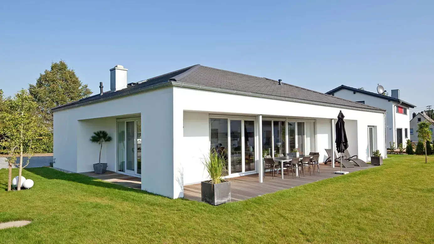 Dieses Einfamilienhaus vereint mit seiner eingeschossigen Bauweise alle Räume auf einer Ebene und trägt somit den Ansprüchen aller Altersklassen im Alltag Rechnung. Faszinierend ist nicht nur die ansprechende Architektur, sondern auch die hellen, lichtdurchfluteten Räume mit ihren großen Fenstertüren, die einen Panoramablick in den eigenen Garten zulassen und zugleich das Gefühl vermitteln, mitten im Grünen zu leben. Konsequent und im Einklang mit der Architektur des Hauses wurde auch die Außenanlage gestaltet. Die teilüberdachte Terrasse lädt nicht nur bei Sonnenschein zum Verweilen im Freien ein.