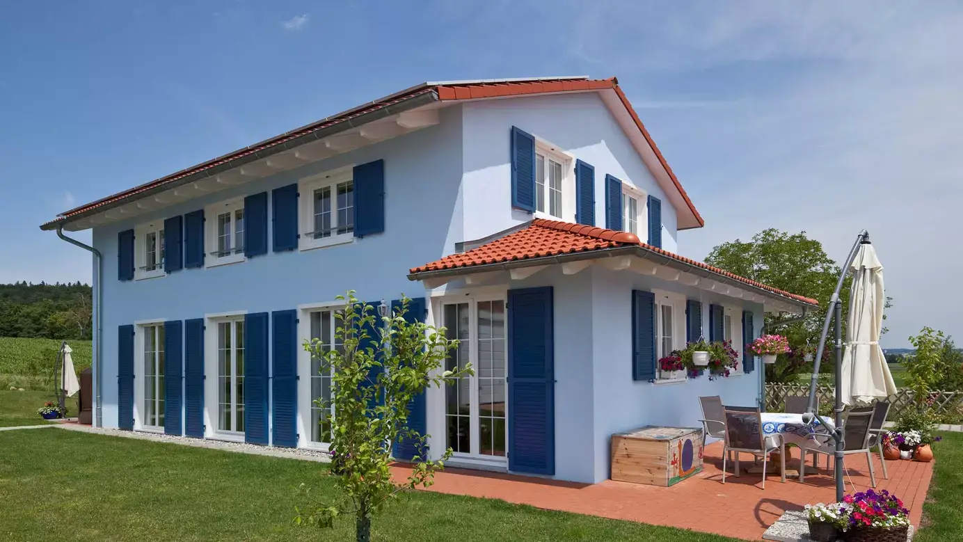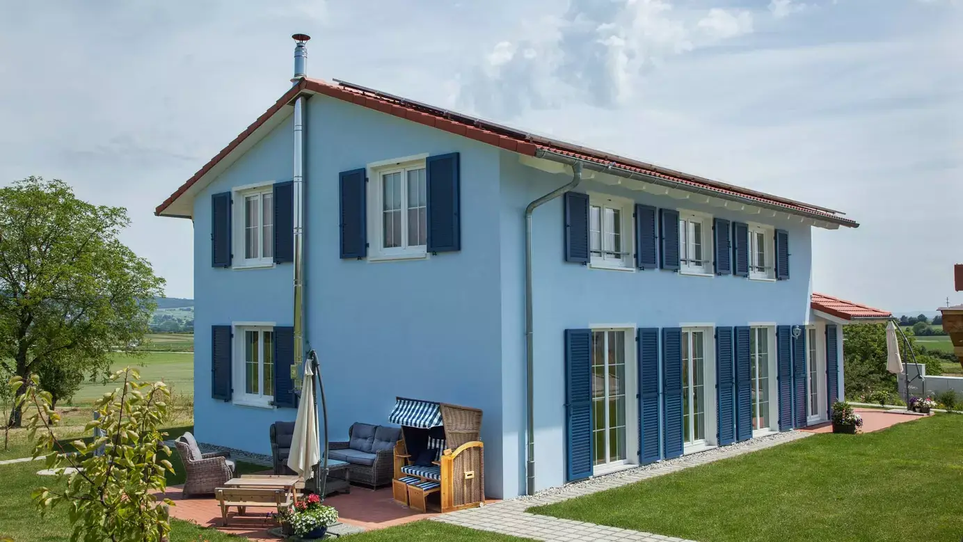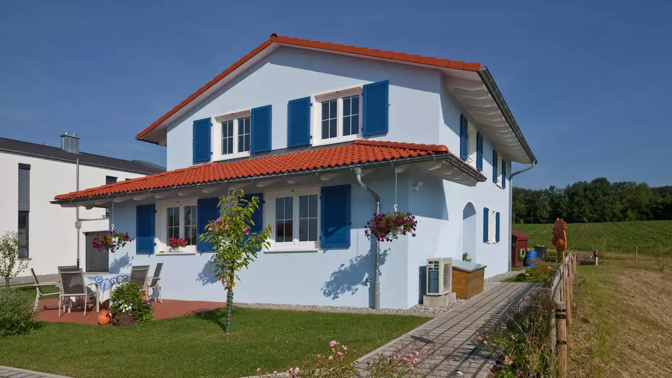 Weiß und blau bestimmen das äußerliche Farbkonzept des rund 8 x 14 m großen Hauses von Familie Zieglmeier, wobei die dunkelblauen Läden einen pfiffigen Kontrast zur hellblauen Fassade setzen. Ein Anbau, mit breit überstehendem Walm-Vordach, sorgt für mehr Wohnfläche im Erdgeschoss sowie für einen überdachten Sitzplatz im Freien. Innen präsentiert das Haus Zieglmeier passen zu seinem ländlichen Charme eine klassische Raumaufteilung. Die Wohnküche mit angegliederter Speisekammer und zusätzlichem Hauswirtschaftsraum bildet das Zentrum, große Glasflächen schaffen einen lichtdurchfluteten Übergang in den Garten. Praktisch ist die Schiebetür zwischen Küche und Wohnebreich, ebenso wie das Arbeits- oder Gästezimmer und das Dusch-WC im insgesamt 90 m² umfassenden Erdgeschoss, das sich so im Alter sogar zum Wohnen auf einer Ebene eignet. Im Obergeschoss ist auf 77 m² Platz für die Individualräume einer vierköpfigen Familie mit zwei Kinderzimmern, einem Schlafzimmer mit separater Ankleide sowie einem gut ausgestatteten Bad. Beheizt wird das Haus durch eine effiziente Luft-Wasser-Wärmepumpe, eine Photovoltaikanlage auf dem Dach produziert eigenen Strom.
