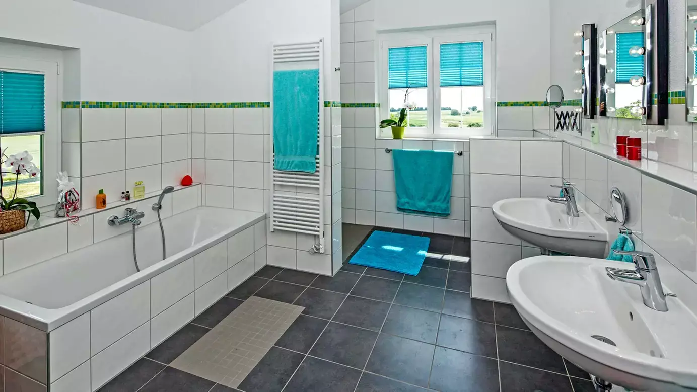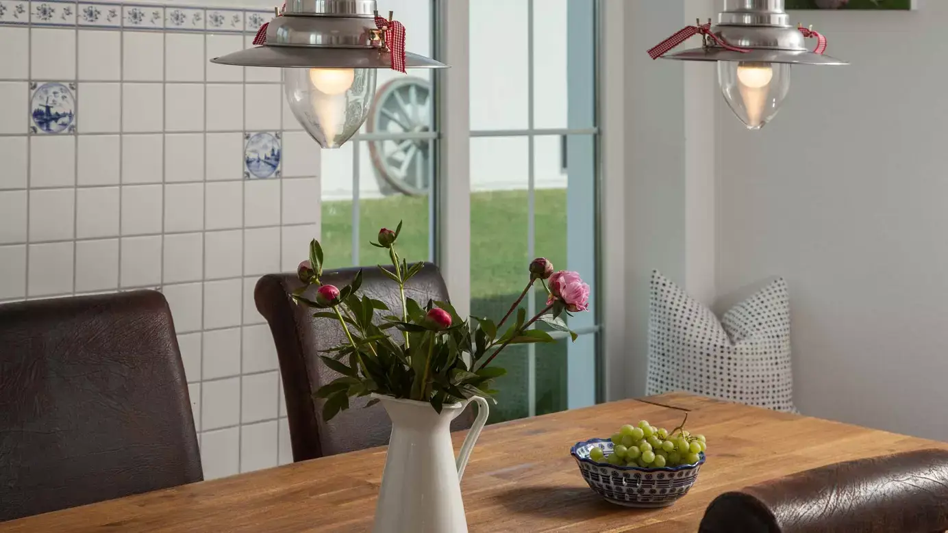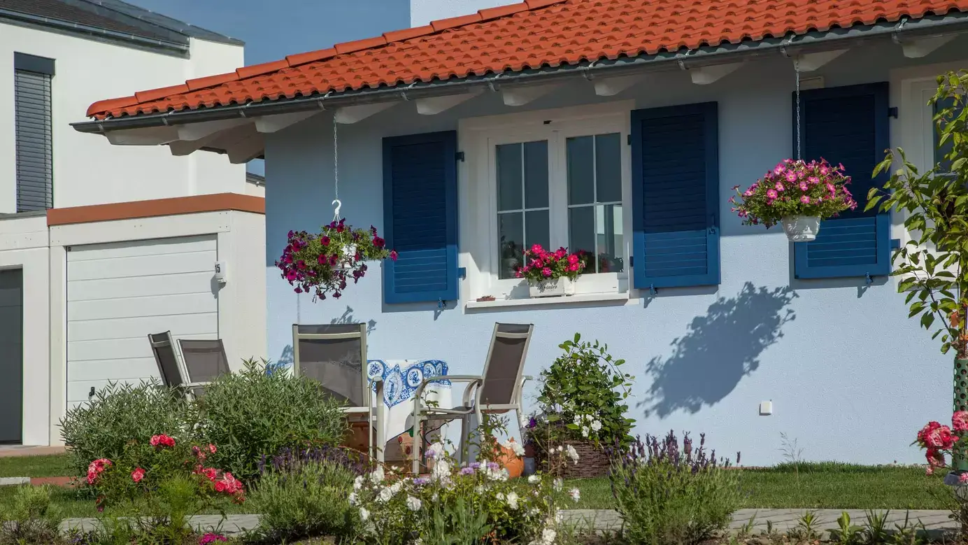 Weiß und blau bestimmen das äußerliche Farbkonzept des rund 8 x 14 m großen Hauses von Familie Zieglmeier, wobei die dunkelblauen Läden einen pfiffigen Kontrast zur hellblauen Fassade setzen. Ein Anbau, mit breit überstehendem Walm-Vordach, sorgt für mehr Wohnfläche im Erdgeschoss sowie für einen überdachten Sitzplatz im Freien. Innen präsentiert das Haus Zieglmeier passen zu seinem ländlichen Charme eine klassische Raumaufteilung. Die Wohnküche mit angegliederter Speisekammer und zusätzlichem Hauswirtschaftsraum bildet das Zentrum, große Glasflächen schaffen einen lichtdurchfluteten Übergang in den Garten. Praktisch ist die Schiebetür zwischen Küche und Wohnebreich, ebenso wie das Arbeits- oder Gästezimmer und das Dusch-WC im insgesamt 90 m² umfassenden Erdgeschoss, das sich so im Alter sogar zum Wohnen auf einer Ebene eignet. Im Obergeschoss ist auf 77 m² Platz für die Individualräume einer vierköpfigen Familie mit zwei Kinderzimmern, einem Schlafzimmer mit separater Ankleide sowie einem gut ausgestatteten Bad. Beheizt wird das Haus durch eine effiziente Luft-Wasser-Wärmepumpe, eine Photovoltaikanlage auf dem Dach produziert eigenen Strom.