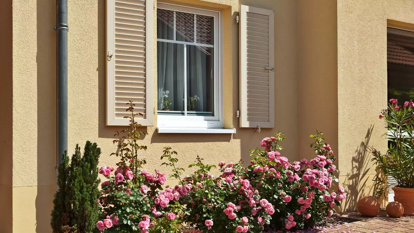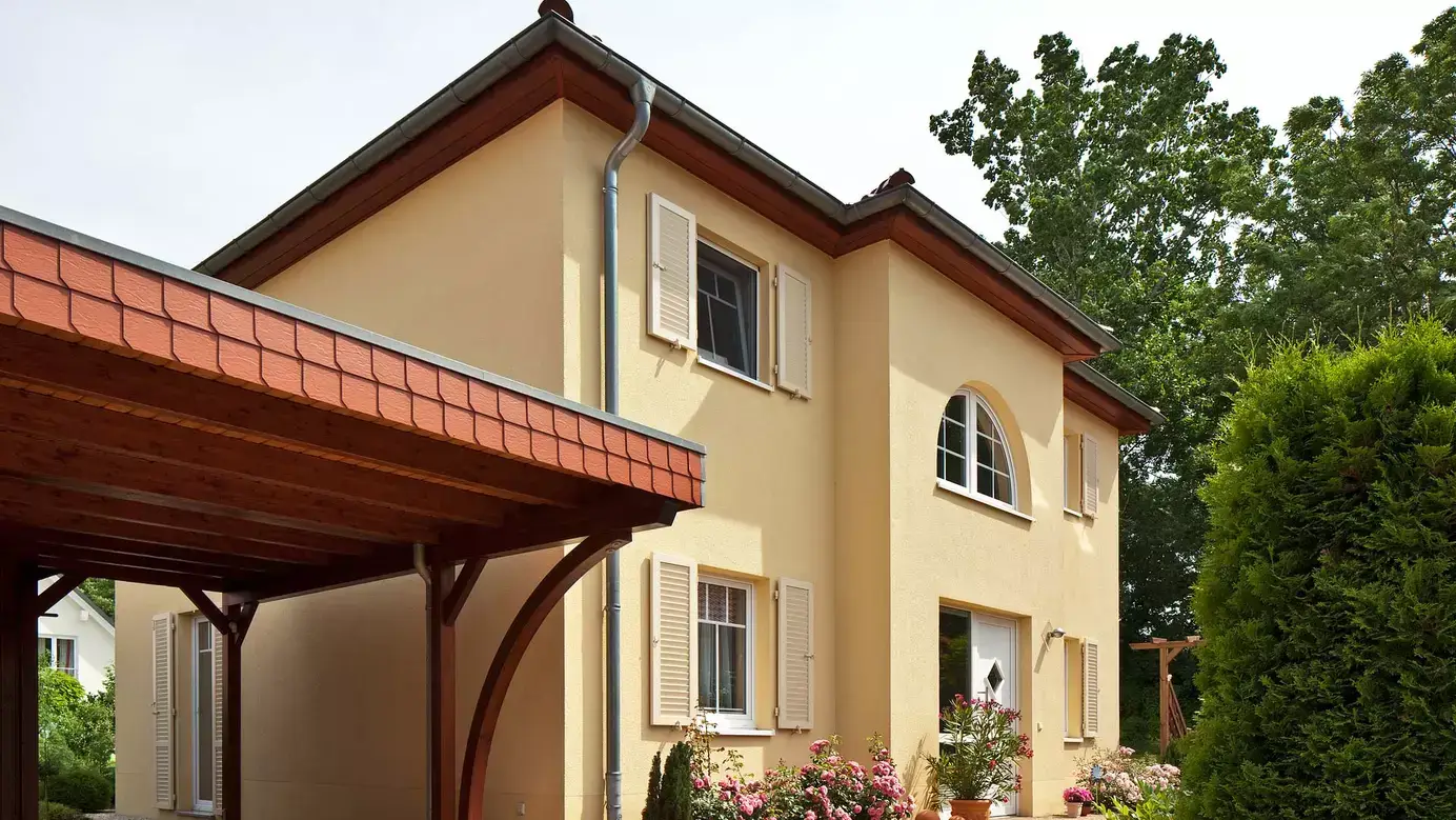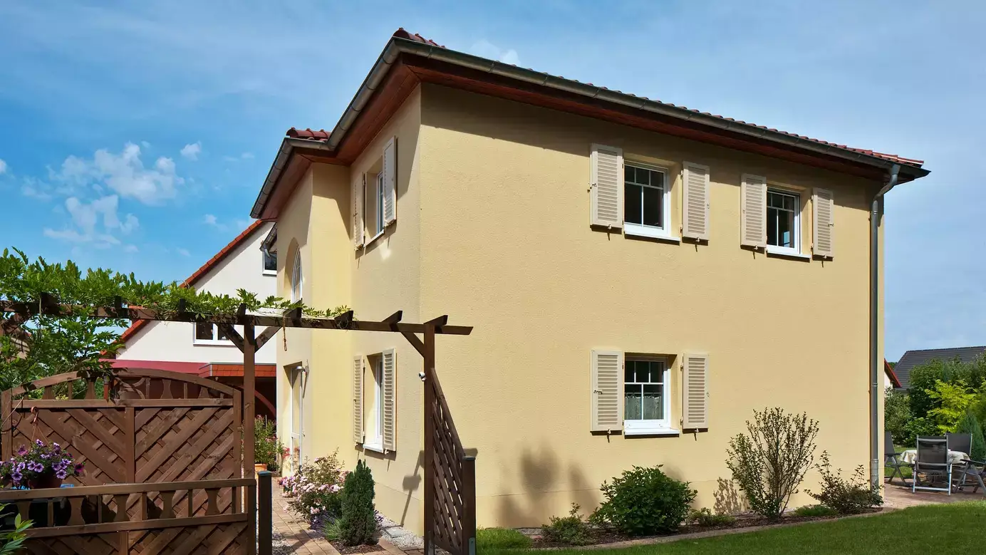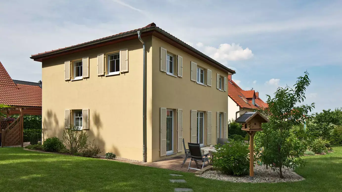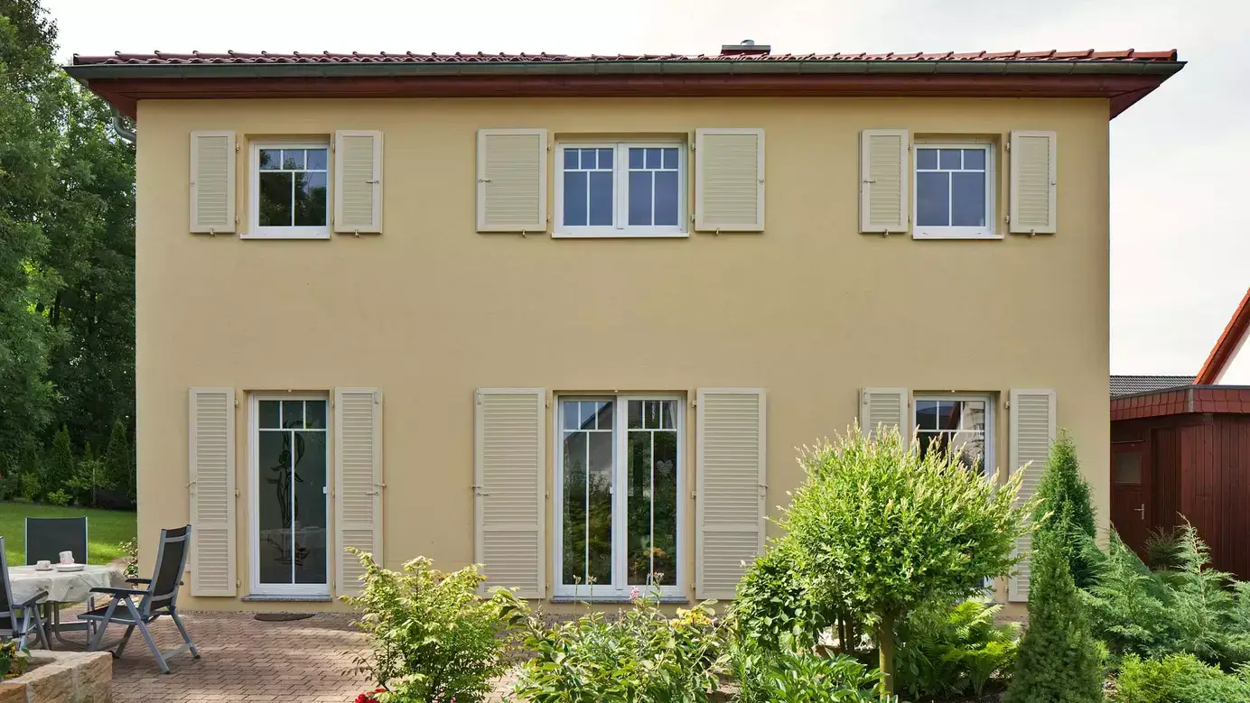 Das Haus der Familie Zimmermann erstrahlt in südfranzösischem Glanz und macht jedes Nach-Hause-Kommen zum Urlaub. Klare Formen, warme Farben, das Ziegel- bzw. stilgetreue Walmdach, das von Holzpfeilern getragene Carport und nicht zuletzt die charmanten Fensterläden (übrigens aus wetterunempfindlichen Aluminium) verleihen Bewohnern wie Gästen unmittelbar ein Gefühl von Sonne und Mittelmeer. Auch innen auf der rund 133 m² großen Wohnfläche wird der Stil mit Materialien in warmen Farben beibehalten und mit weißen Elementen aufgelockert. Im Eingangsbereich führt eine Treppe aus Buche und Edelstahl ins Obergeschoss. Dahinter liegt der Wohnbereich, der wiederum offen in den Essplatz und schließlich in die Küche übergeht. Bodentiefe Fenstertüren sorgen für viel Licht und öffnen den Weg zum Garten. In der Sitzecke setzt der Kamin einen ganz besonders gemütlichen Akzent. Die einzelnen Innen-Bereiche können durch elegante, zweiflüglige Holztüren voneinander getrennt werden. Weiterhin befinden sich ein Arbeits- oder Gästezimmer, ein Hauswirtschaftsraum sowie eine Garderobe und ein Gäste-WC im Erdgeschoss. Das Obergeschoss wird geprägt durch eine luftige Galerie, zwei Kinderzimmer, ein Elternschlafzimmer mit Ankleidebereich und ein Familienbad. Wohlige Wärme bringt die effiziente Fußbodenheizung ins Haus.